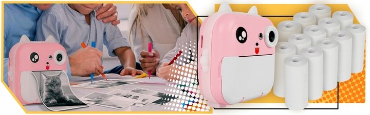 ✳️ Super uroczy ✳️ Lekki i kompaktowy ✳️ 5 wbudowanych gier ✳️ Aplikacja po polsku ✳️ Nagrywanie filmików i robienie zdjęć ✳️ Czarno-biały druk 200 dpi z prędkością 10 mm/s ✳️13 rolek papieru GRATIS!