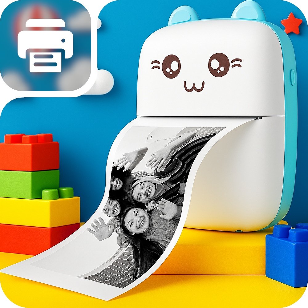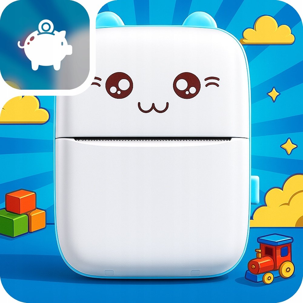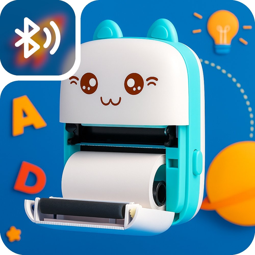 To mini drukarka termiczna od KANZA w kształcie uroczo uśmiechniętego niebieskiego kotka 🐱💙. Nie potrzebuje żadnych tuszów ani tonerów – wystarczy jedna rolka papieru i możesz drukować wszystko, co chcesz!