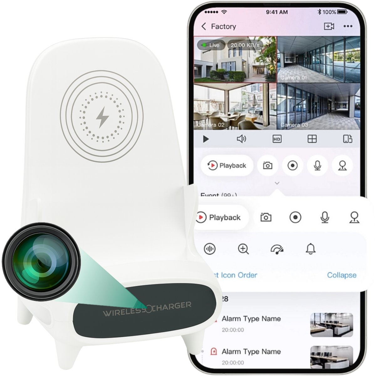 Dzięki temu, że kamera ukryta jest w obudowie standardowej ładowarki indukcyjnej, nikt nie domyśli się jej prawdziwej funkcji, a Ty masz pełen wgląd w sytuację z dowolnego miejsca przez aplikację HorizonCam.
