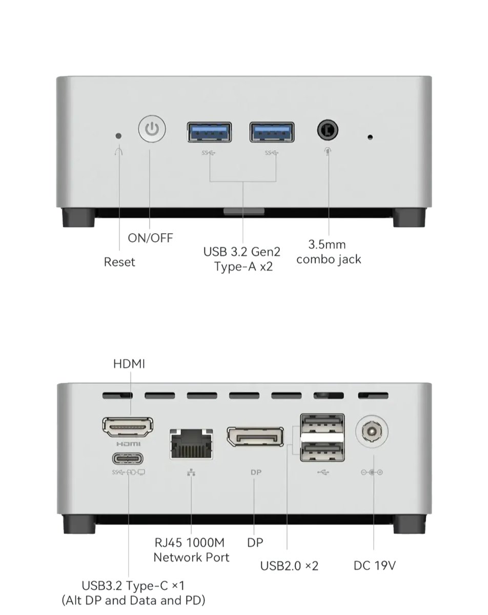 Minikomputer Minisforum UN100L pomimo swojej małej budowy jest urządzeniem bardzo wielofunkcyjnym. Wszystko z uwagi na mnogość portów znajdujących się zarówno z przodu, jak i z tyłu urządzenia. Znajdziesz w nim następujące wejścia / wyjścia: