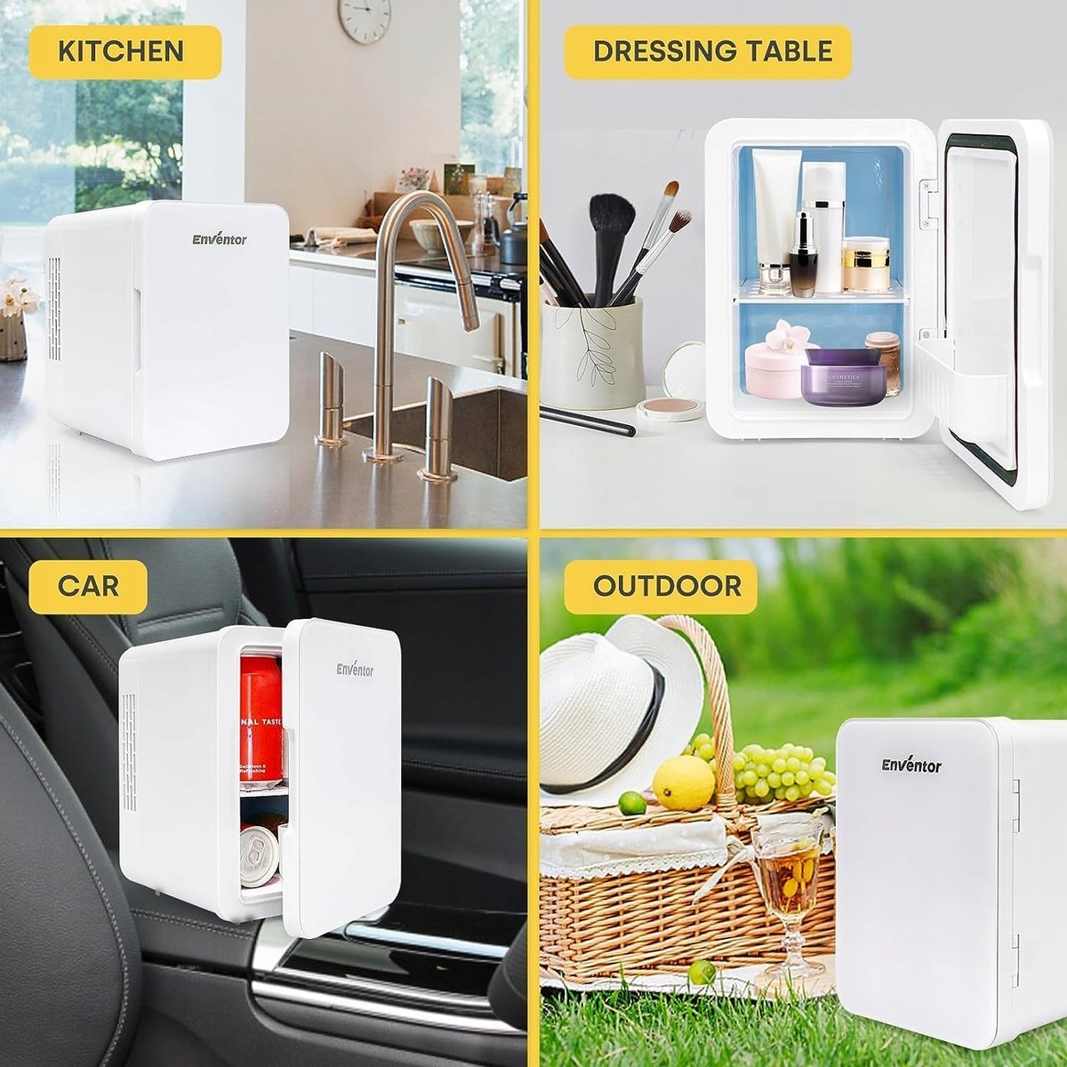 Dzięki kompaktowej i unikalnej konstrukcji ta mała lodówka zajmuje bardzo mało miejsca, dzięki czemu idealnie nadaje się do sypialni, pod biurkiem i na komodach. Lekki i łatwy do przenoszenia, z wygodnym, ergonomicznym uchwytem do przenoszenia, idealnie nadaje się na wycieczki, pikniki, kemping i nie tylko!