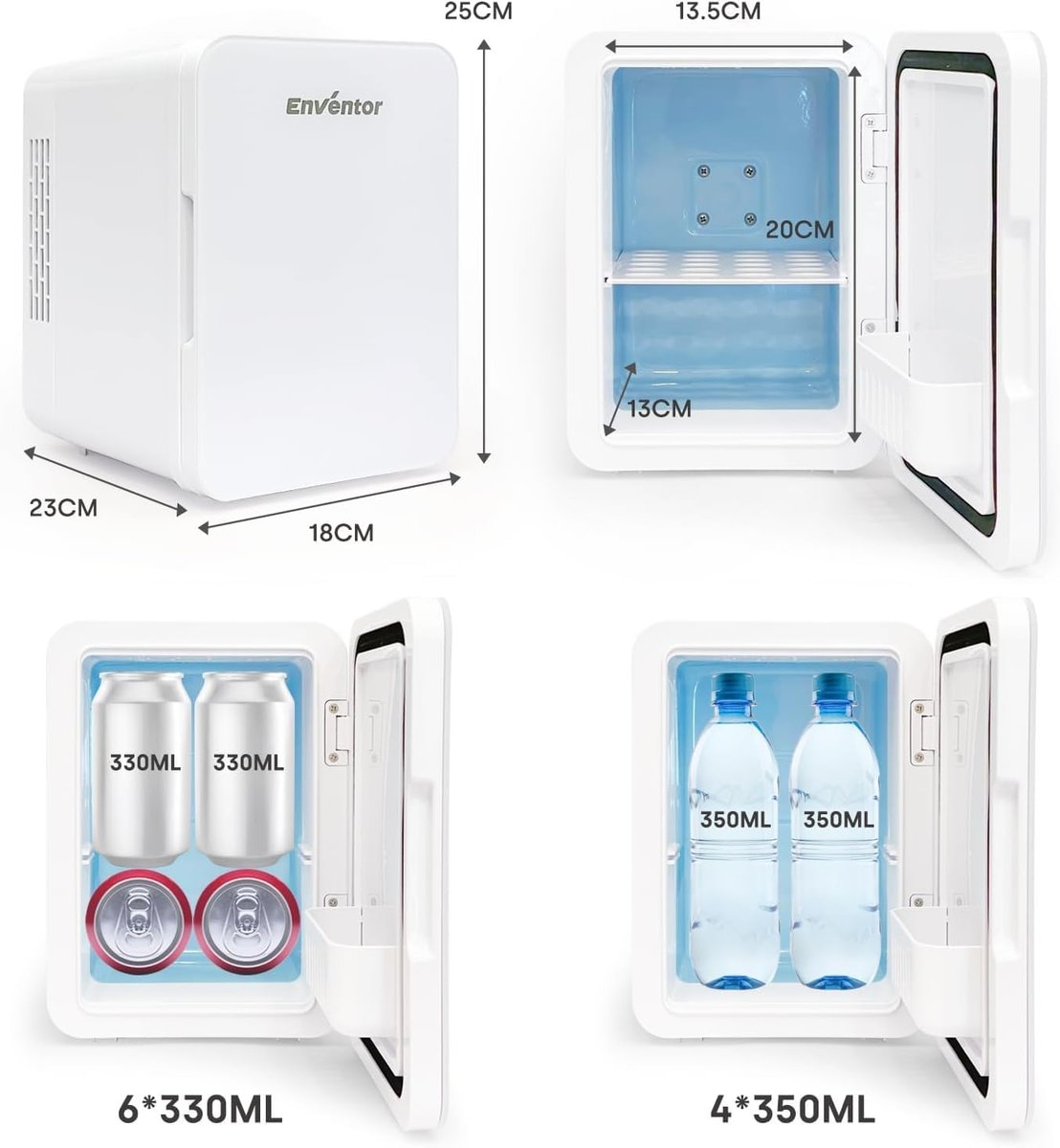 Mieści 6 puszek po 330 ml każda, jej wymiary wewnętrzne to (wys.) 20,6 cm x (szer.) 14 cm x (gł.) 14,2 cm. Ta kompaktowa mini lodówka o pojemności 4 litrów ma wyjmowaną półkę, która umożliwia łatwe oddzielanie przekąsek i napojów, mleka matki oraz produktów kosmetycznych i pielęgnacyjnych.