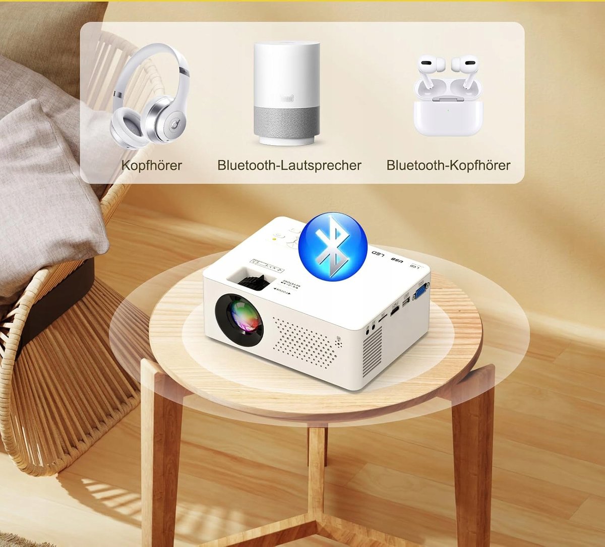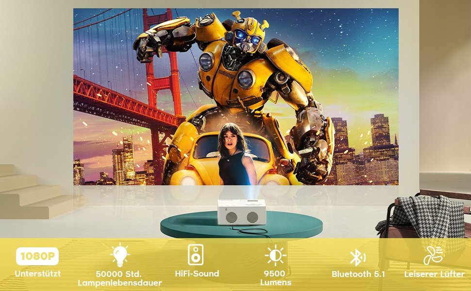 Ten przenośny projektor filmowy jest wyposażony w szklaną soczewkę z technologią powlekania optycznego, która zapewnia doskonałą przepuszczalność światła i niską dyspersję, co zapewnia długotrwałą czystość i doskonałą jakość obrazu. Rozdzielczość natywna 1280 x 720p, wysoki współczynnik kontrastu i bardzo szeroka gama kolorów zapewniają wyjątkowo precyzyjną i żywą jakość wideo. Dzięki technologii Bluetooth 5.1 możesz cieszyć się wciągającym dźwiękiem bez użycia kabli.