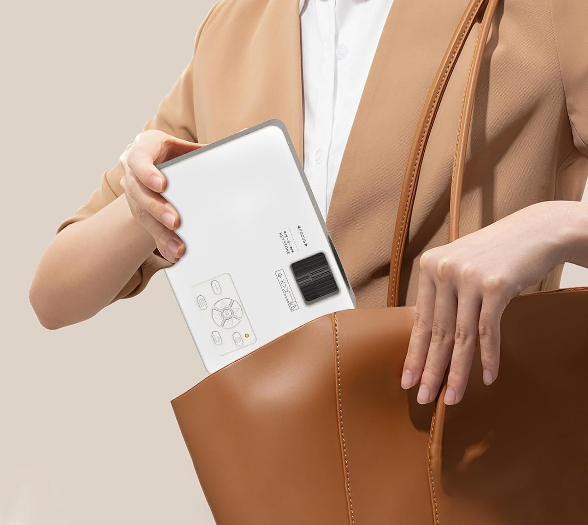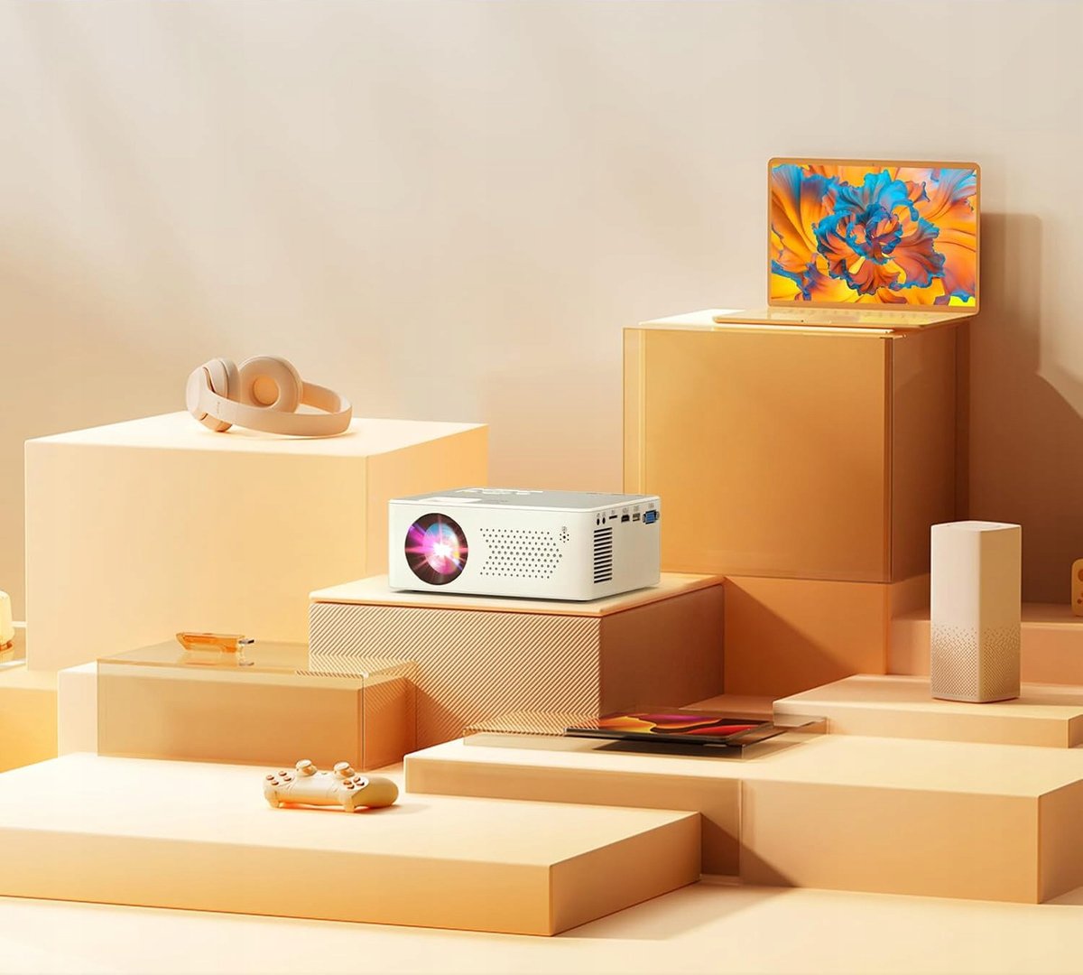 Projektor ma piękny, biały wygląd. Ma lekko matową powierzchnię w przeciwieństwie do innych projektorów dostępnych na rynku z normalnymi obudowami z tworzywa sztucznego. Zakochasz się w nim, gdy go dotkniesz. Dzięki dołączonemu paskowi do noszenia można go wszędzie ze sobą zabrać.