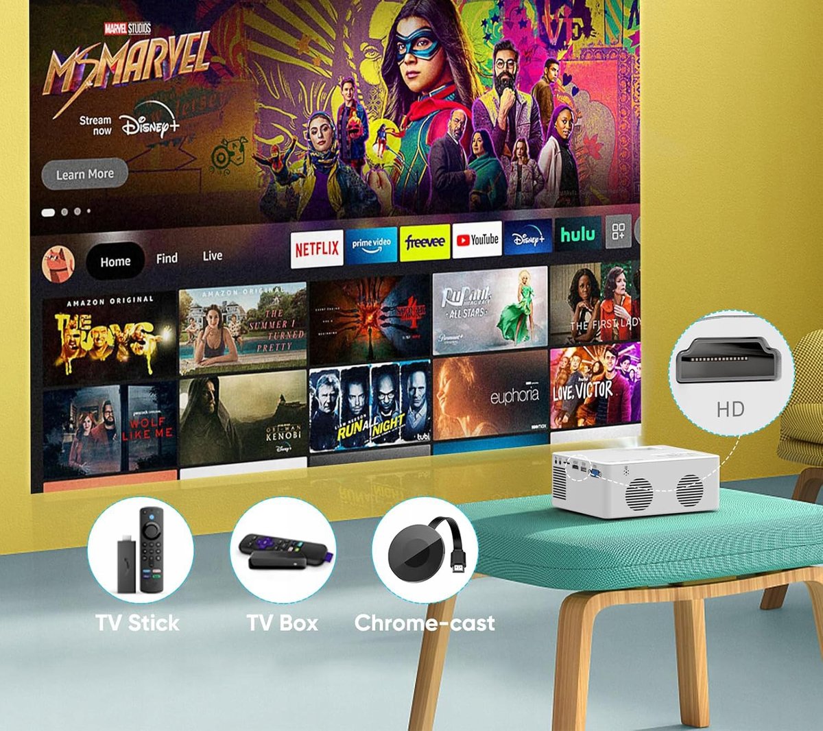 Ten mini projektor jest wyposażony w wiele wejść, takich jak HDMI, USB, AV i TF. Podłącz do tego projektora swój pendrive TV i ciesz się niekończącą się rozrywką – zawsze i wszędzie. (Wskazówka: Do filmów chronionych prawem autorskim, takich jak Netflix, Prime Video itd. potrzebny jest pendrive lub kabel HDMI). Jego funkcja Bluetooth 5.1 umożliwia bezprzewodowe połączenie głośników i słuchawek Bluetooth. Ciesz się imponującymi wrażeniami dźwiękowymi bez konieczności przewracania się różnymi kablami.