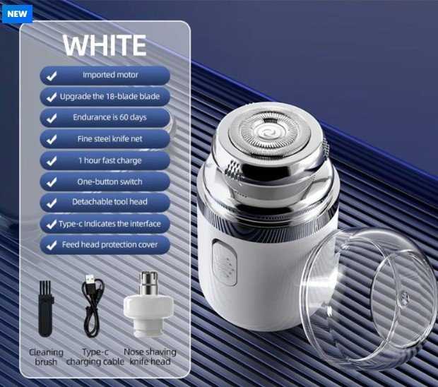 Przenośna golarka elektryczna 2 w 1 Mini-Shaver. Ta mini golarka została zaprojektowana w kompaktowym, kieszonkowym rozmiarze, dzięki czemu idealnie nadaje się do podróży.