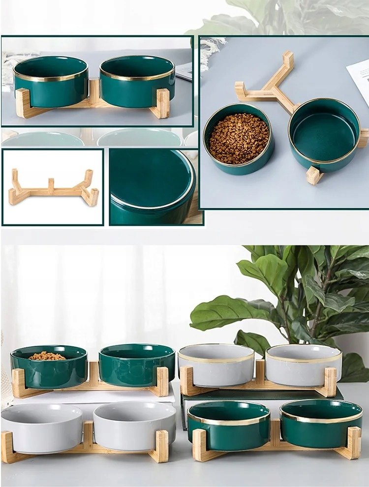 2 ceramiczne miski umiejscowione stabilnej podstawie z naturalnego drewna, bez ołowiu i kadmu.