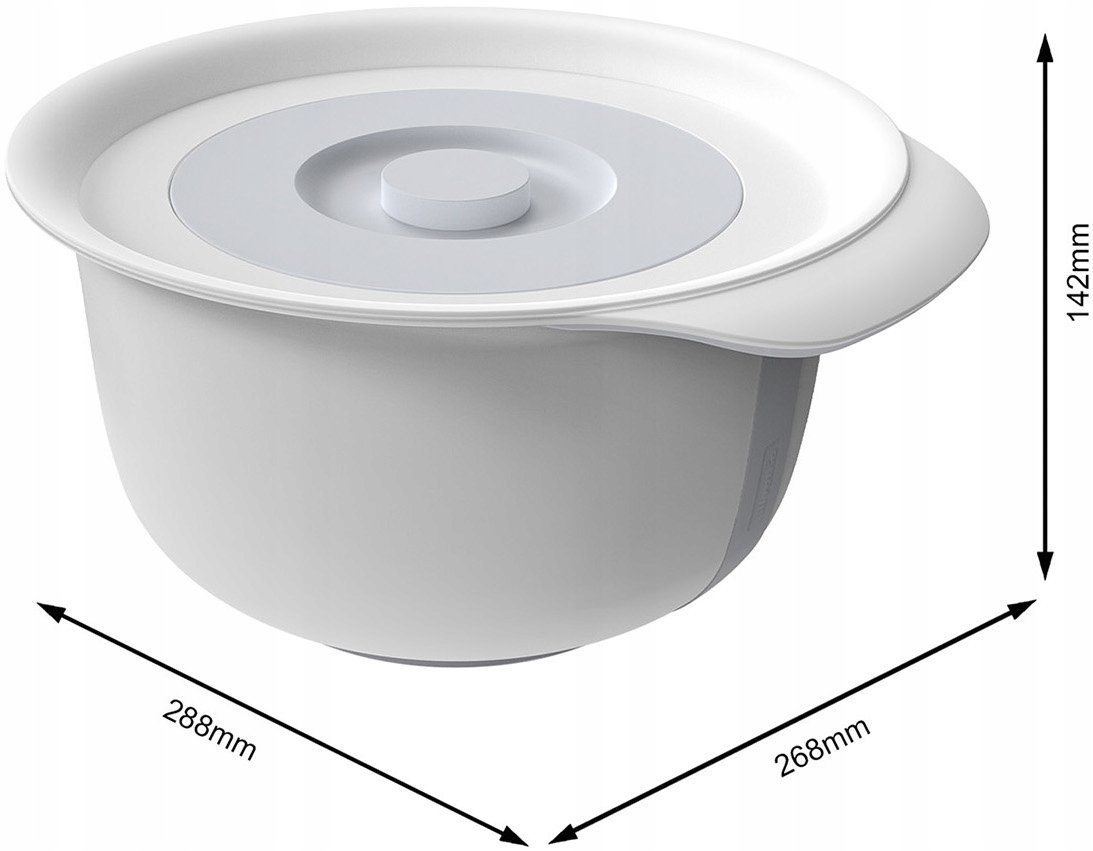 Ten praktyczny zestaw zawiera wszystko, czego potrzebujesz do pieczenia: dwie wysokiej jakości miski do mieszania w różnych rozmiarach, dwuczęściową pokrywę z osłoną przeciw bryzgową, wygodny uchwyt i podstawa, która spoczywa na blacie, nie ślizgając się. Miski nadają się zatem szczególnie do mieszania i mieszania oraz są popularnym pomocnikiem podczas pieczenia i gotowania. Solidna miska z antypoślizgową podstawą Dzięki ergonomicznemu uchwytowi miska dobrze leży w dłoni i zapewnia komfort pracy. Antypoślizgowy pierścień na podłodze pozwala pewnie stać nawet podczas pracy z mikserem, a dzięki pierścieniowi przeciw bryzgowemu na blacie nie pozostają żadne plamy. W oddzielnej małej misce można na przykład oddzielnie ważyć składniki. Dzięki pokrywce miska idealnie nadaje się również do przechowywania żywności.