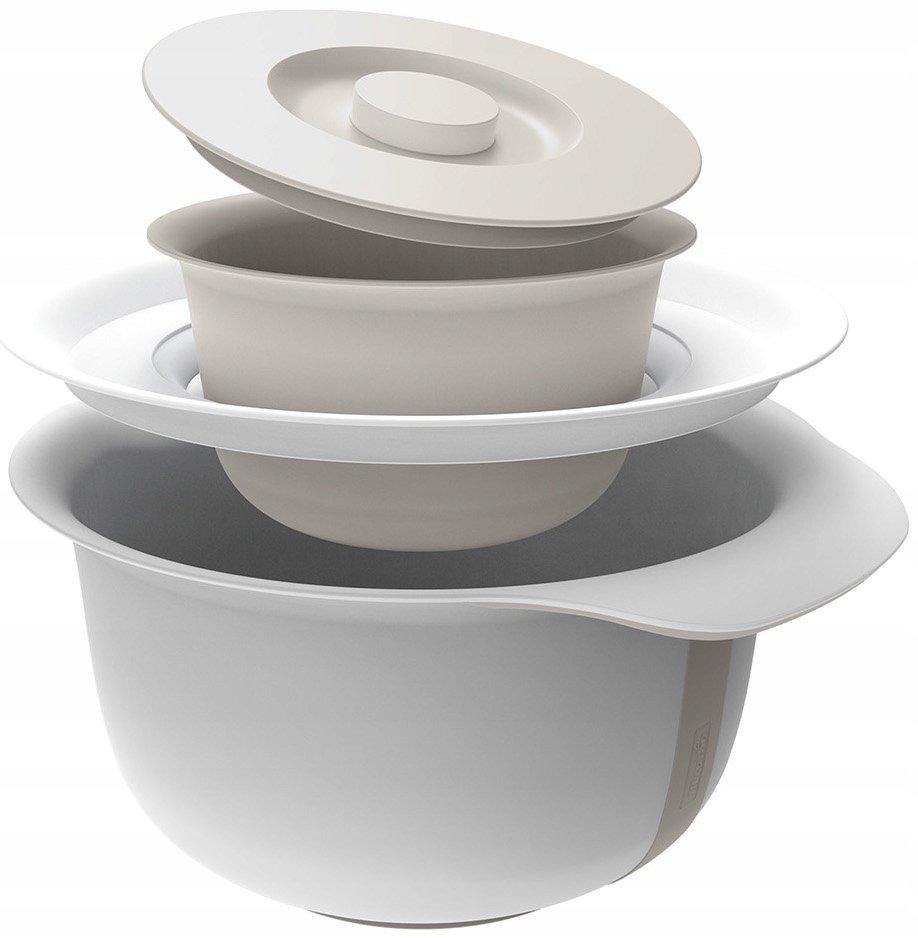 Zestaw misek do mieszania wykonany z wysokiej jakości tworzywa sztucznego (PP), niezawierającego BPA, Uniwersalne: np. do mieszania ciasta, ale także do mieszania sałatek itp., W zestawie miski w dwóch rozmiarach, Z pierścieniem antypoślizgowym dno - Ergonomicznie ukształtowany uchwyt zapewniający wygodną pracę, Z pokrywą i pierścieniem zabezpieczającym przed rozbryzgami, Można myć w zmywarce, nadaje się do kontaktu z żywnością, Dostępne w różnych kolorach .