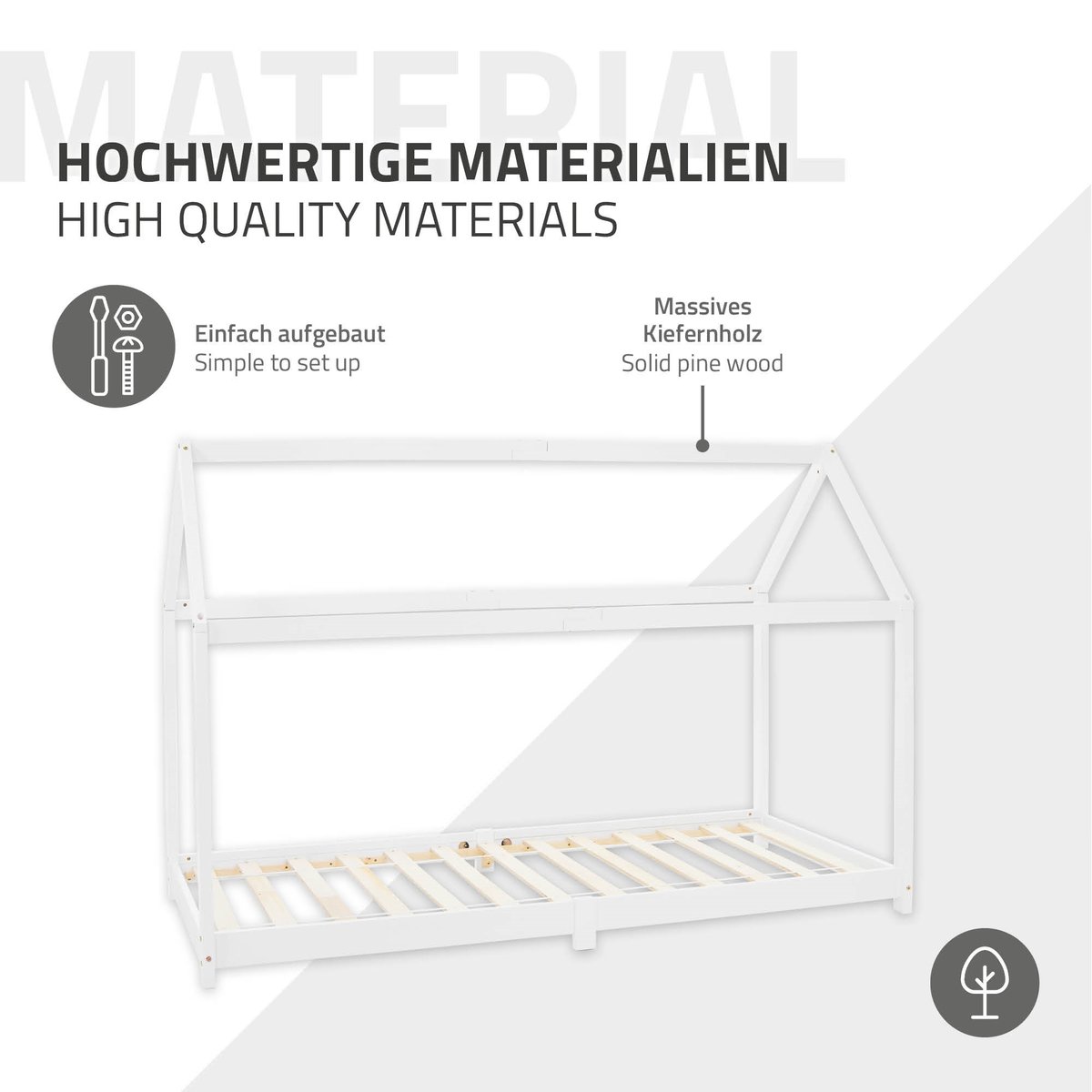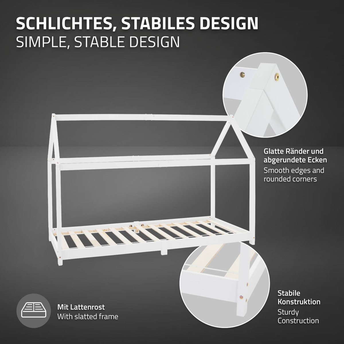 Przytulne łóżko dziecięce idealnie pasuje do każdego pokoju dziecięcego i jest szczególnie przyjazne dla dzieci dzięki solidnej konstrukcji z drewna sosnowego i zabawnemu wzornictwu. Łóżko dziecięce z otwartym dachem zachwyci Twoje dzieci, ponieważ nie ma ograniczeń dla ich wyobraźni: to nie tylko przytulne miejsce do spania, ale także idealne miejsce do zabawy. Montaż jest szybki i łatwy dzięki dołączonej instrukcji.