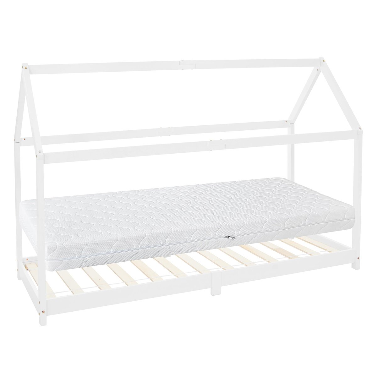 Właśnie zrecenzowałem ML-Design łóżko dziecięce 90x200 cm biały z materacem H:16 cm dachem i stelażem z listew domek drewniany sosnowy stabilne łóżko młodzieżowe