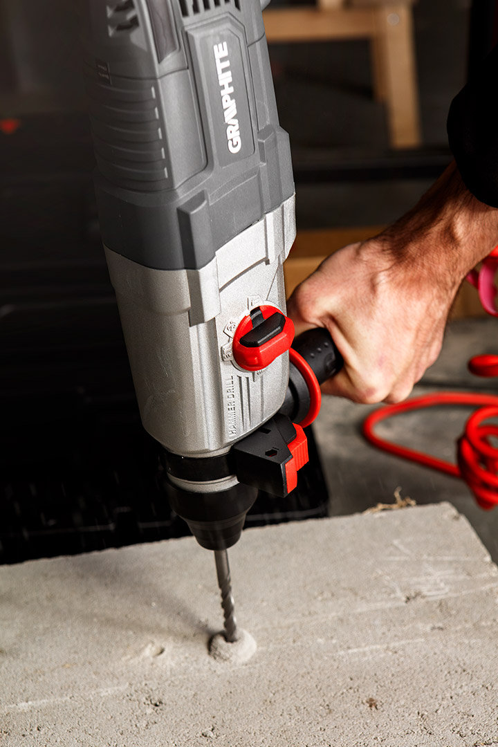 ✴Młotowiertarka SDS+ 710 W, 2,6J, walizka 58G537 marki GRAPHITE to specjalistyczne narzędzie SDS+ o mocy 710 W, posiadające funkcje wiercenia, wiercenia z udarem pneumatycznym, podkuwania i możliwość regulacji bezstopniowej kąta ustawienia dłuta do precyzyjnego podkuwania.