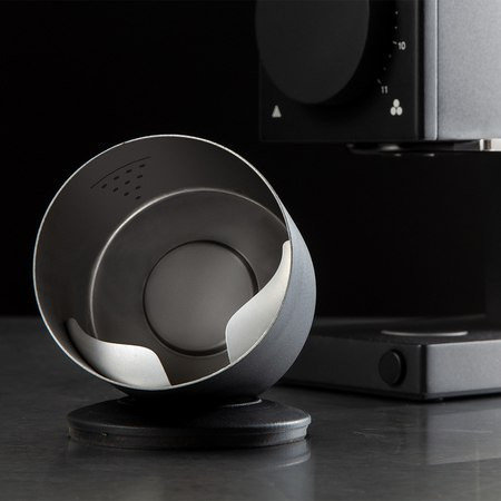 Pojemnik na zmieloną kawę jest wykonany z aluminium. Na jego dnie jest magnes, który pozwala na łatwe umiejscowienie pojemnika na młynku. Zastosowano tu także rozwiązanie znane z profesjonalnych młynków - łopatka umieszczona przy zsypie pomaga pozbyć się resztek kawy z urządzenia, dzięki czemu retencja młynka jest wyjątkowo niska.