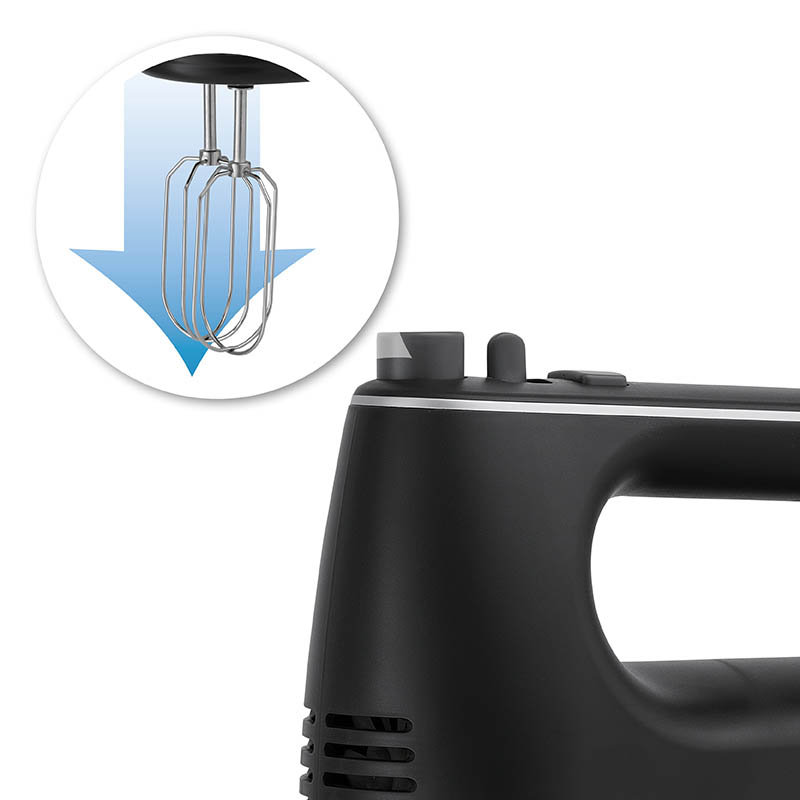 5 trybów prędkości daje możliwość wyboru optymalnego trybu dla każdego składnika.Tryb Turbo pozwala znacznie zwiększyć prędkość obrotu dysz miksera. Możesz użyć trybu Turbo, aby szybko rozbić grudki ciasta i dodać objętość ubijanym składnikom. Tryb Turbo pozwala szybko zamienić miękkie i delikatne produkty w gładkie puree.
