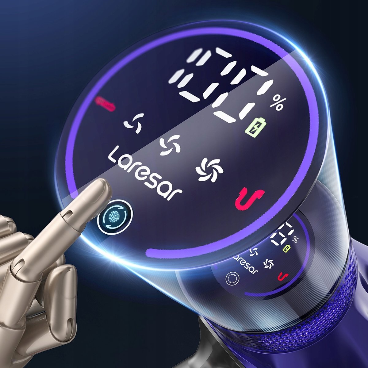 Duży ekran LED wyświetla poziom naładowania baterii w czasie rzeczywistym oraz umożliwia łatwą regulację mocy ssania.