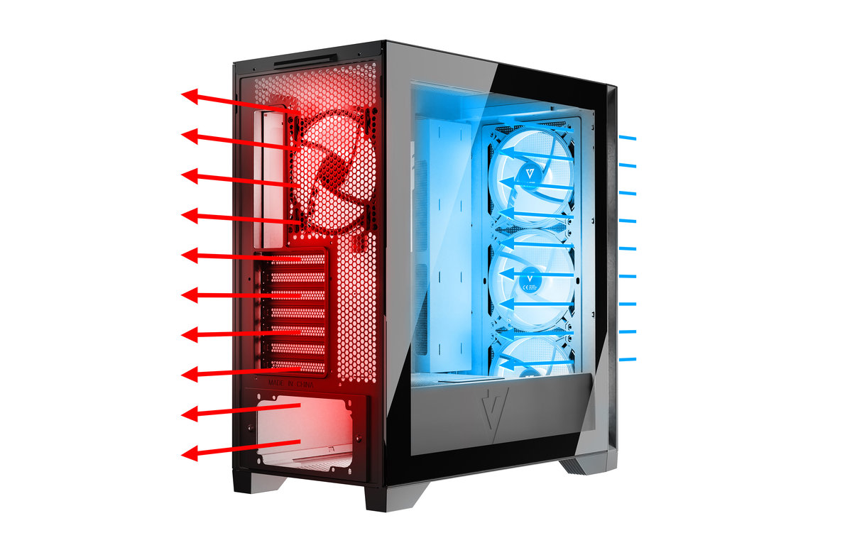 Chłodną pracę komponentów zapewniają cztery fabrycznie zamontowane wentylatory ARGB. Trzy 140 mm ARGB na froncie wtłaczają chłodne powietrze do środka komputera, podczas gdy jeden 140 mm ARGB wyciąga gorące powietrze na zewnątrz.