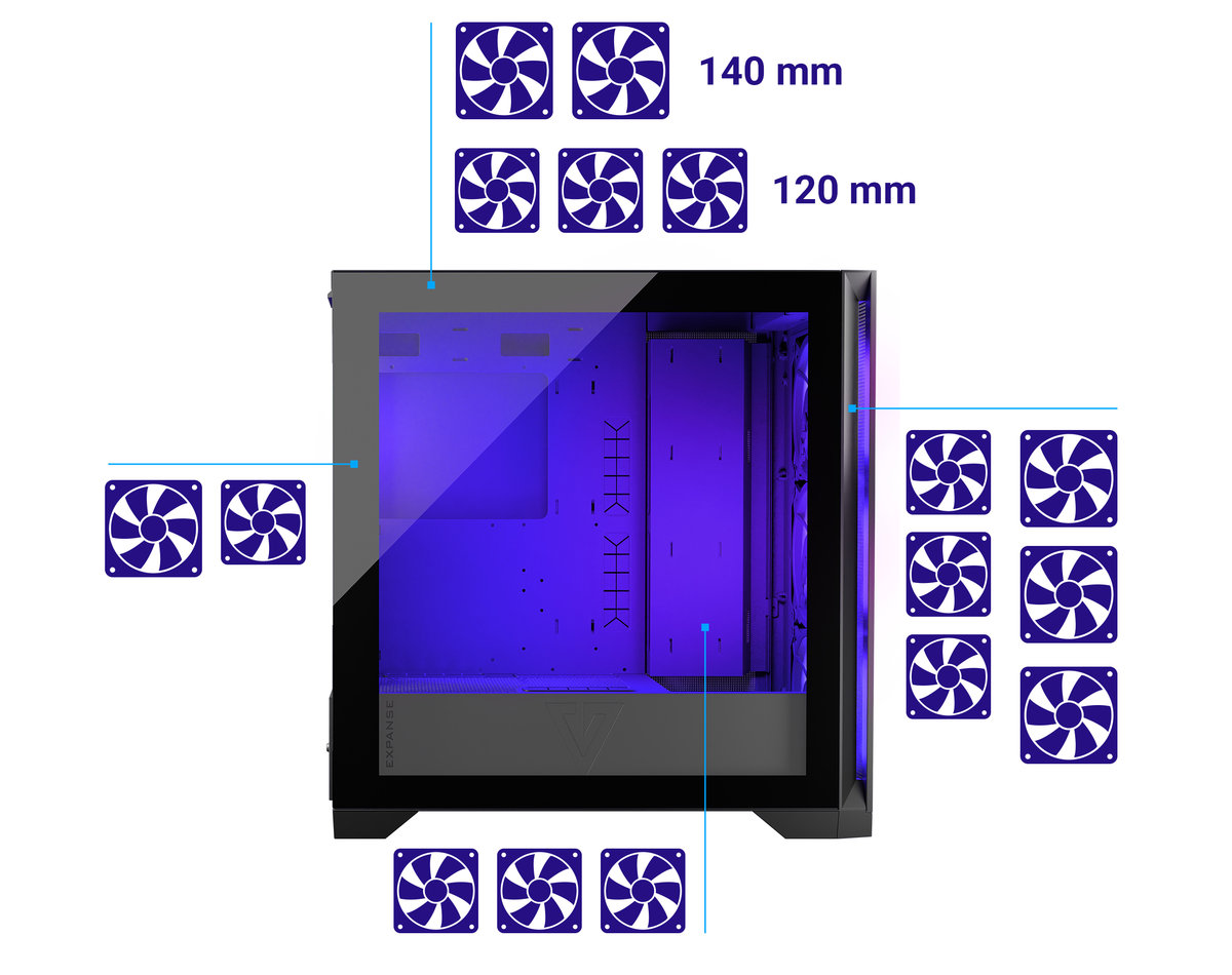 Jeżeli natomiast zapragniesz mieć jeszcze większe możliwości konfiguracji, to na panelu górnym możesz zainstalować dodatkowo 3 wentylatory 120 mm lub 2 x 140 mm.