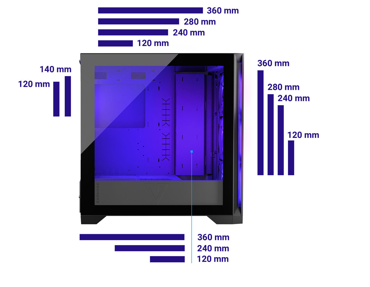 - Możliwość montażu wodnego systemu chłodzenia: góra: 120mm/240mm/280mm/360mm, przód: 120mm/240mm/280mm/360mm, tył: 120/140mm, tacka płyty głównej: 120mm/240mm/360mm