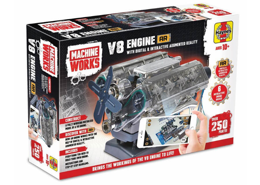 Haynes V8 Engine to profesjonalny techniczno-edukacyjny model silnika pojazdu samochodowego w układzie V, który jest najczęściej wykorzystywany w samochodach sportowych i wyczynowych. Zestaw zawiera wszystkie części dzięki którym zbudujesz model silnika spalinowego posiadający 8 cylindrów (2 rzędy pod kątem 90 stopni po 4 cylindry w rzędzie). Zestaw zawiera również wszystkie narzędzia, potrzebne do skonstruowania modelu. Świetny prezent dla dzieci interesujących się mechaniką/motoryzacją.