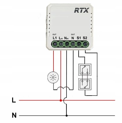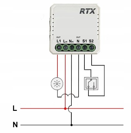 Moduł przekaźnika instaluje się w puszce pod tradycyjnym włącznikiem światła. Po podłączeniu zgodnym ze schematem będzie można sterować zapalaniem światła zdalnie z aplikacji, tradycyjnie włącznikiem lub w sposób zautomatyzowany według wcześniej zaprogramowanych scenariuszy.