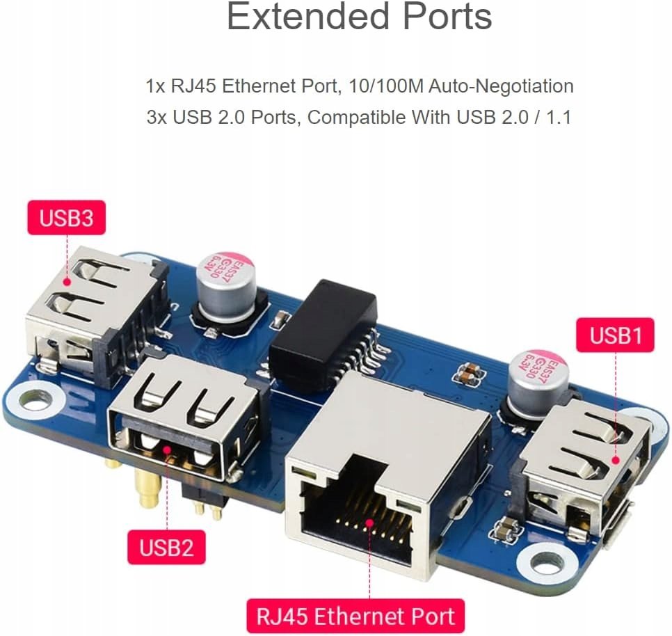 Dodaje 3 porty USB 2.0 oraz port Ethernet RJ45 10/100M oparty na chipie RTL8152B.