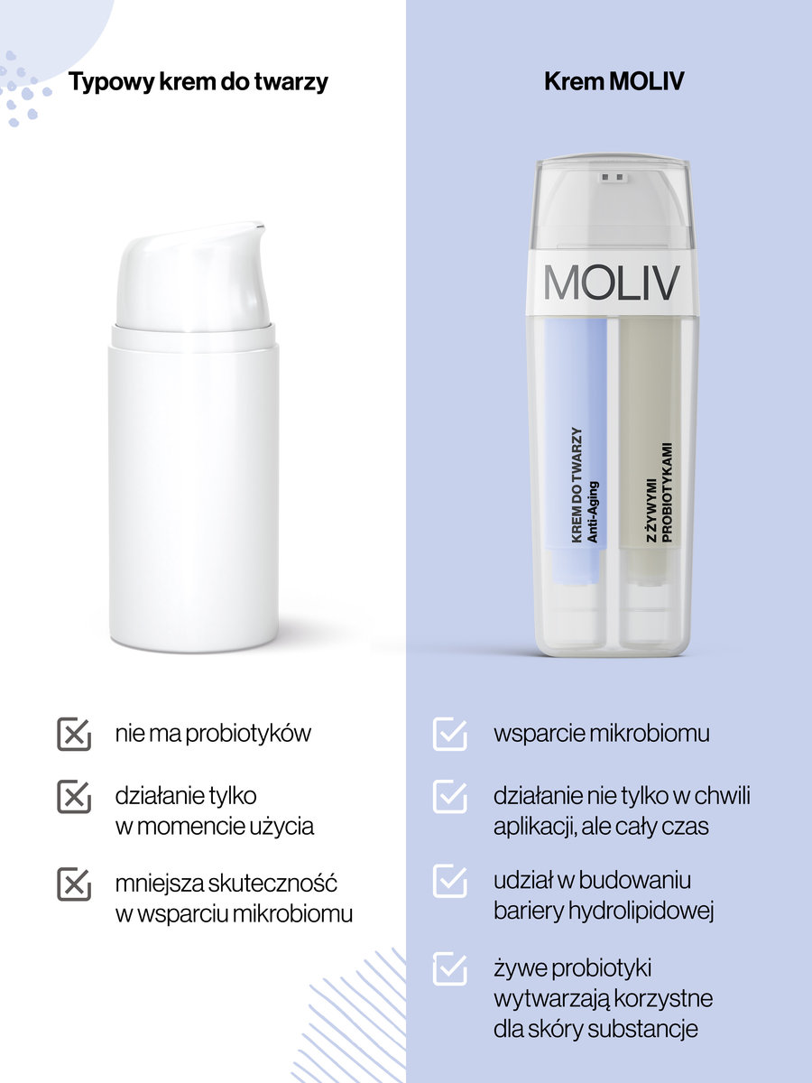 MOLIV Krem do twarzy z żywymi probiotykami. Anti-aging. 30ml Wyjątkowy krem anti-aging MOLIV Poznaj niezwykły produkt, jakim jest krem anti-aging MOLIV. Jest to ...