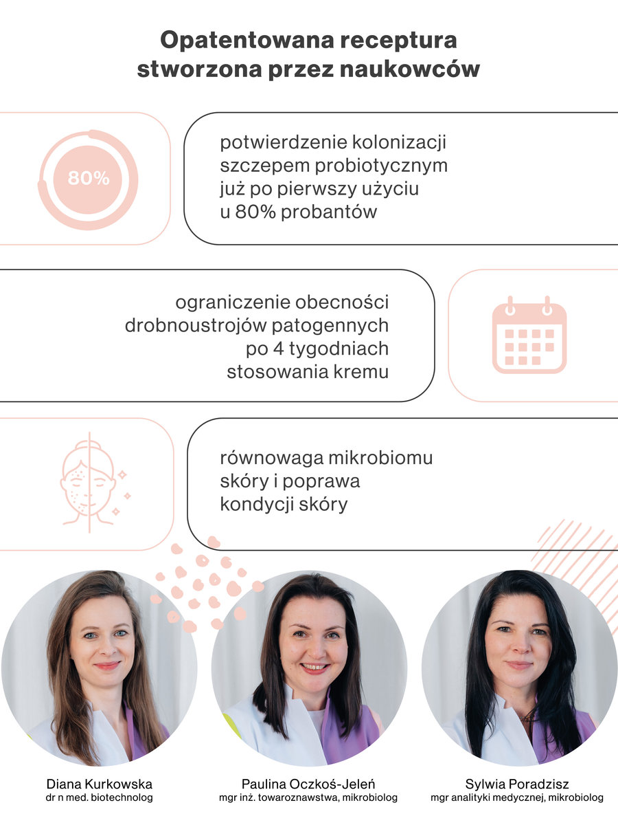 Dzięki innowacyjnej formule 3P krem dostarcza skórze również prebiotyki oraz postbiotyki, które są kluczowe dla żywotności probiotyków. Dobroczynne bakterie zajmują receptory w skórze, eliminując miejsce dla patogenów, co skutkuje mniejszą ilością niedoskonałości. Skóra wygląda zdrowiej, starzeje się wolniej i jest gładsza.