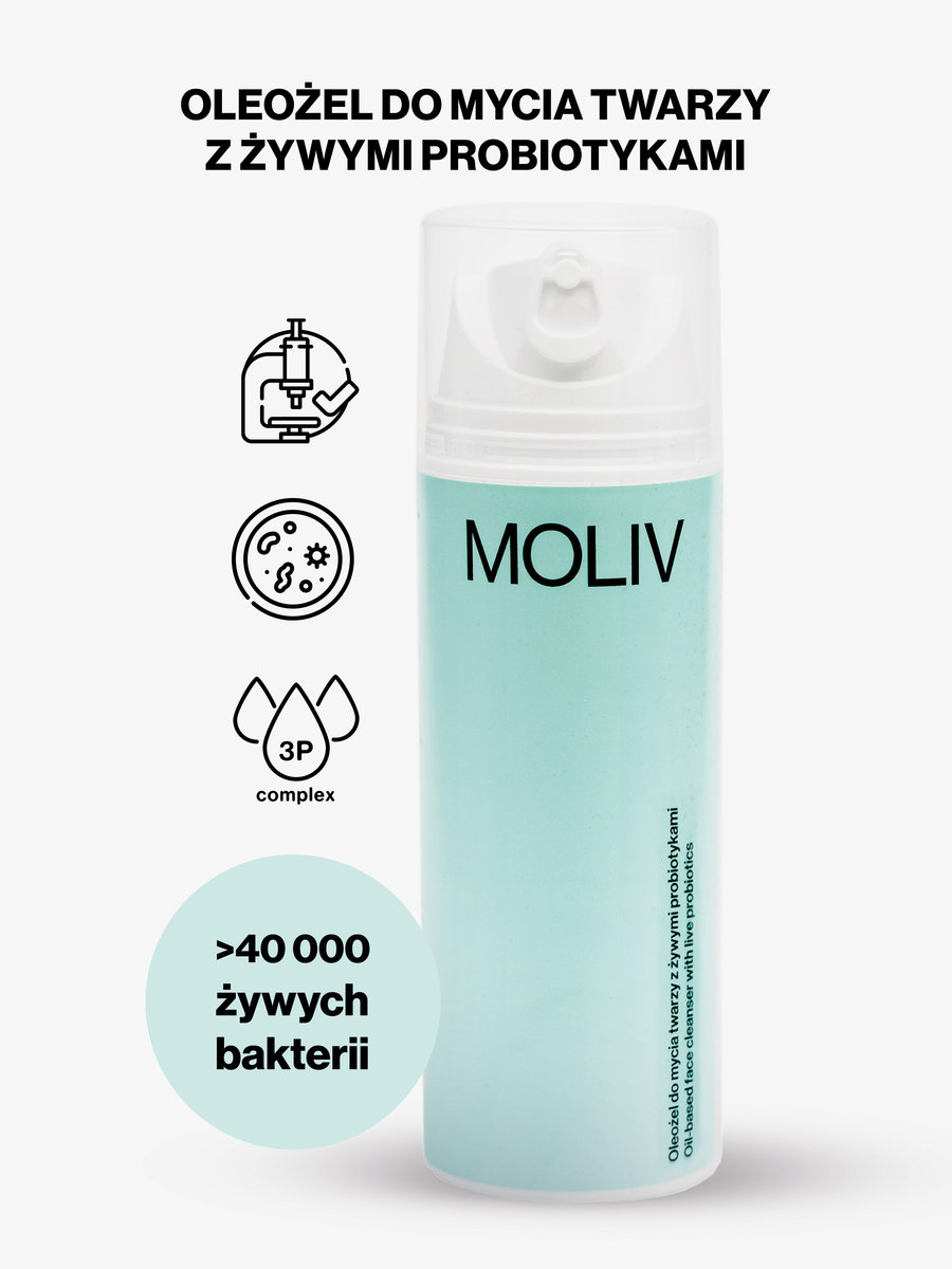 Unikalna, olejowa konsystencja oleożelu MOLIV w kontakcie z wodą tworzy delikatną, białą emulsję, która efektywnie zmywa zanieczyszczenia oraz nadmiar sebum, nie pozostawiając uczucia ściągniętej skóry. Produkt jest pierwszym w Polsce środkiem do mycia twarzy zawierającym żywe bakterie probiotyczne, co sprawia, że jest pionierem w pielęgnacji skóry z probiotykami.