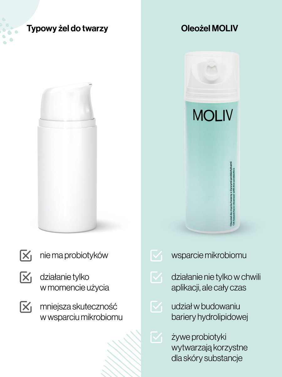 Oleożel MOLIV skutecznie oczyszcza, zmywa makijaż i zanieczyszczenia, nie powodując przy tym uczucia ściągnięcia skóry. Dzięki zawartości żywych bakterii probiotycznych Lactobacillus plantarum, produkt nie tylko czyści, ale i regeneruje mikrobiom skóry, przywracając jej naturalne, kwaśne pH.