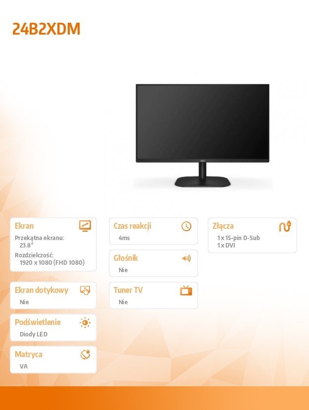 | Nazwa: | Monitor, AOC, 24B2XDM, 23.8", VA, DVI |