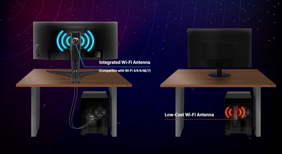 Monitor Phantom Gaming PG27QFT1B jest wyposażony we wbudowaną antenę Wi-Fi. Zatem sygnał Wi-Fi nie będzie maskowany przez stół. Teraz podłącz antenę Wi-Fi do komputera i ciesz się grą bez opóźnień.