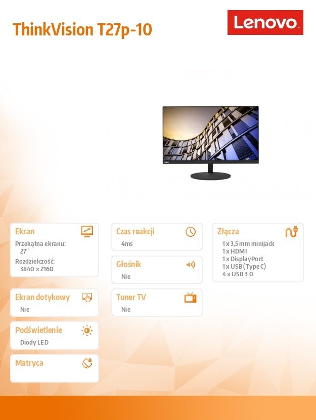 | Nazwa: | Monitor LENOVO ThinkVision T27p-10, 27", IPS, 4 ms, 16:9, 3840x 2160 |