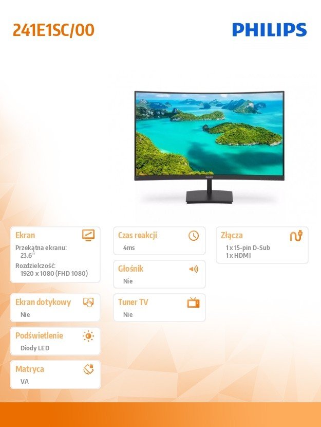 | Nazwa: | Monitor, Philips, 241E1SC, 23.6", Curved, VA, HDMI, Freesync |