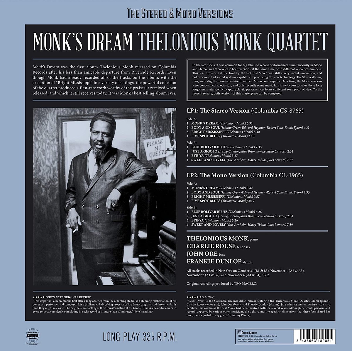 2-płytowa winylowa 180-gramowa, limitowana edycja kultowego albumu "Monk's Dream". Utwory zarejestrowano w systemie DMM (Direct Metal Mastering).