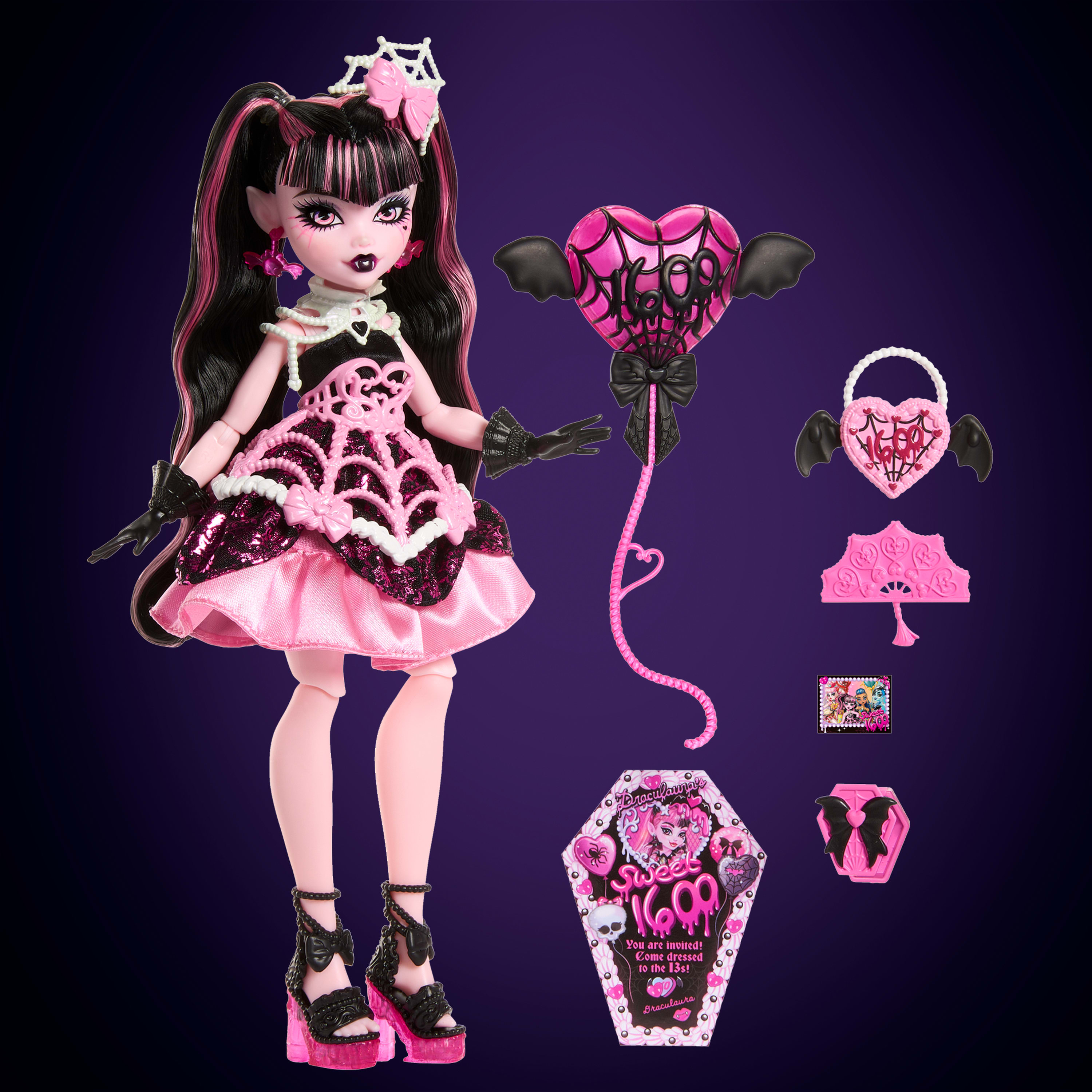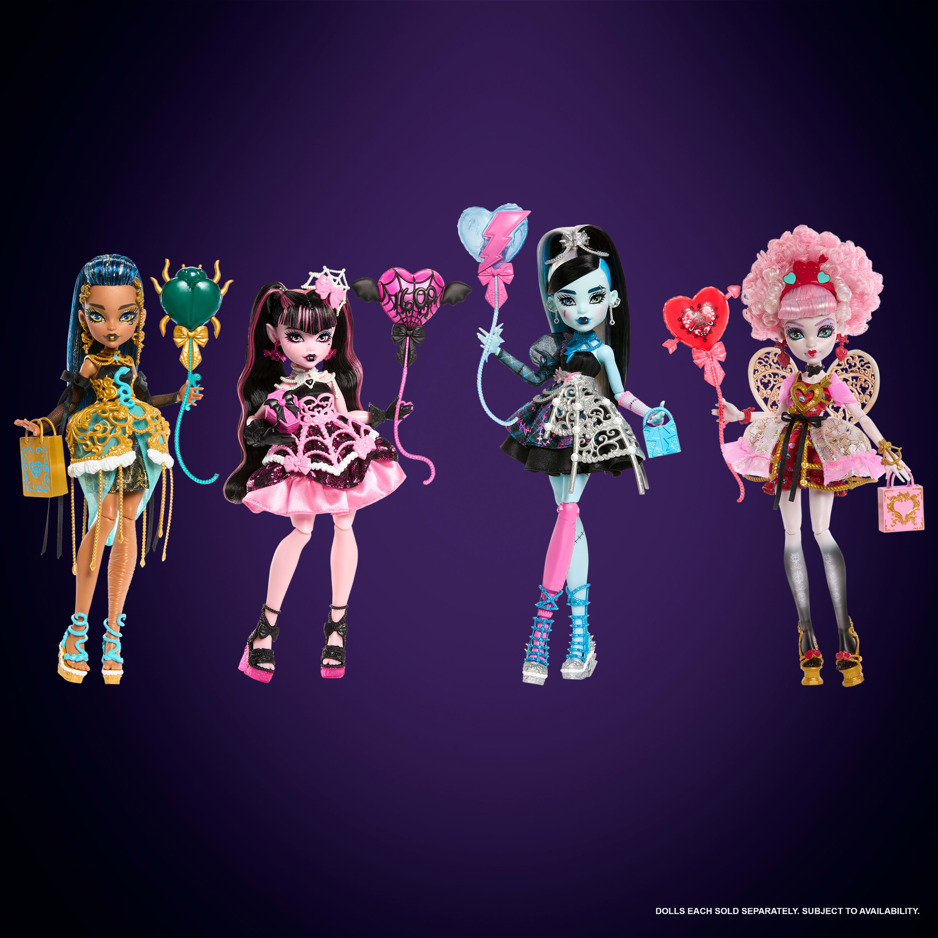 Draculaura wyprawia wielkie przyjęcie urodzinowe, a dla lalek Monster High oznacza to imprezę stulecia! W końcu nie co dzień kończy się 1600 lat! Jak to uczcić? Oczywiście organizując najbardziej niesamowite przyjęcie urodzinowe w historii! Każda lalka z serii Straszysłodkie urodziny robi potwornie stylowe wrażenie, a w zestawie ma „balon”, zaproszenie, kartkę urodzinową, prezent i inne akcesoria. Dzięki tak wielu uroczym elementom ta lalka jest gotowa bawić się i świętować jak nigdy! Inne lalki są sprzedawane oddzielnie, zależnie od dostępności. Lalki nie stoją samodzielnie. Kolory i elementy dekoracyjne mogą się różnić.