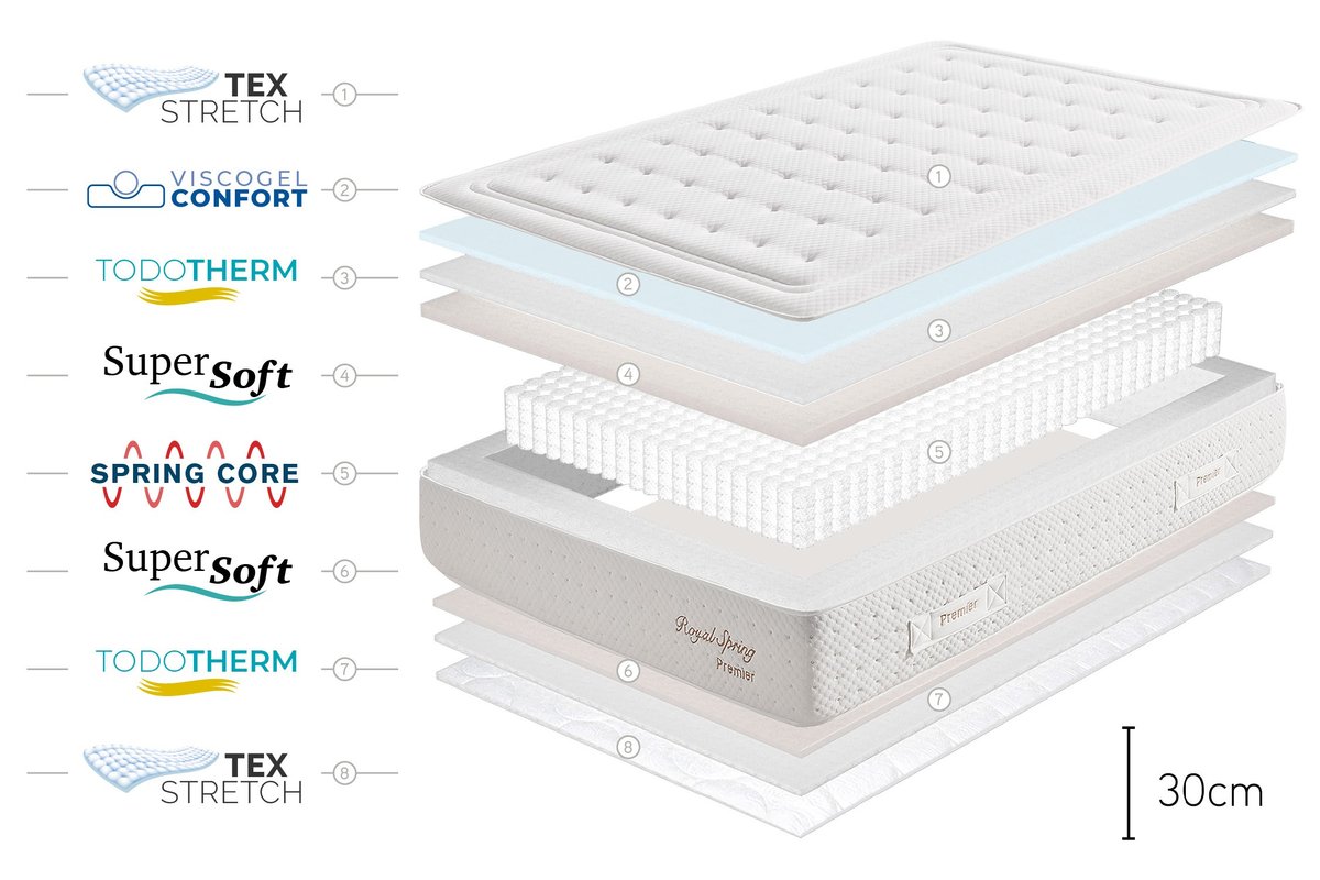 PIANKA LEPKOSPRĘŻYSTA: jego system komfortu składający się z 11 cm warstwy żelowej pianki lepkosprężystej, SuperSoft Foam i włókien todotherm zapewnia stopniowe dopasowanie się materacu do użytkownika. Dostosowuje się do każdej pozycji spania. Ponadto żelowa pianka lepkosprężysta jest wykonana w bardziej zaawansowanej technologii niż tradycyjna pianka z pamięcią kształtu. Dzięki temu lepiej reguluje temperaturę ciała, zapewniając satysfakcjonujący odpoczynek.