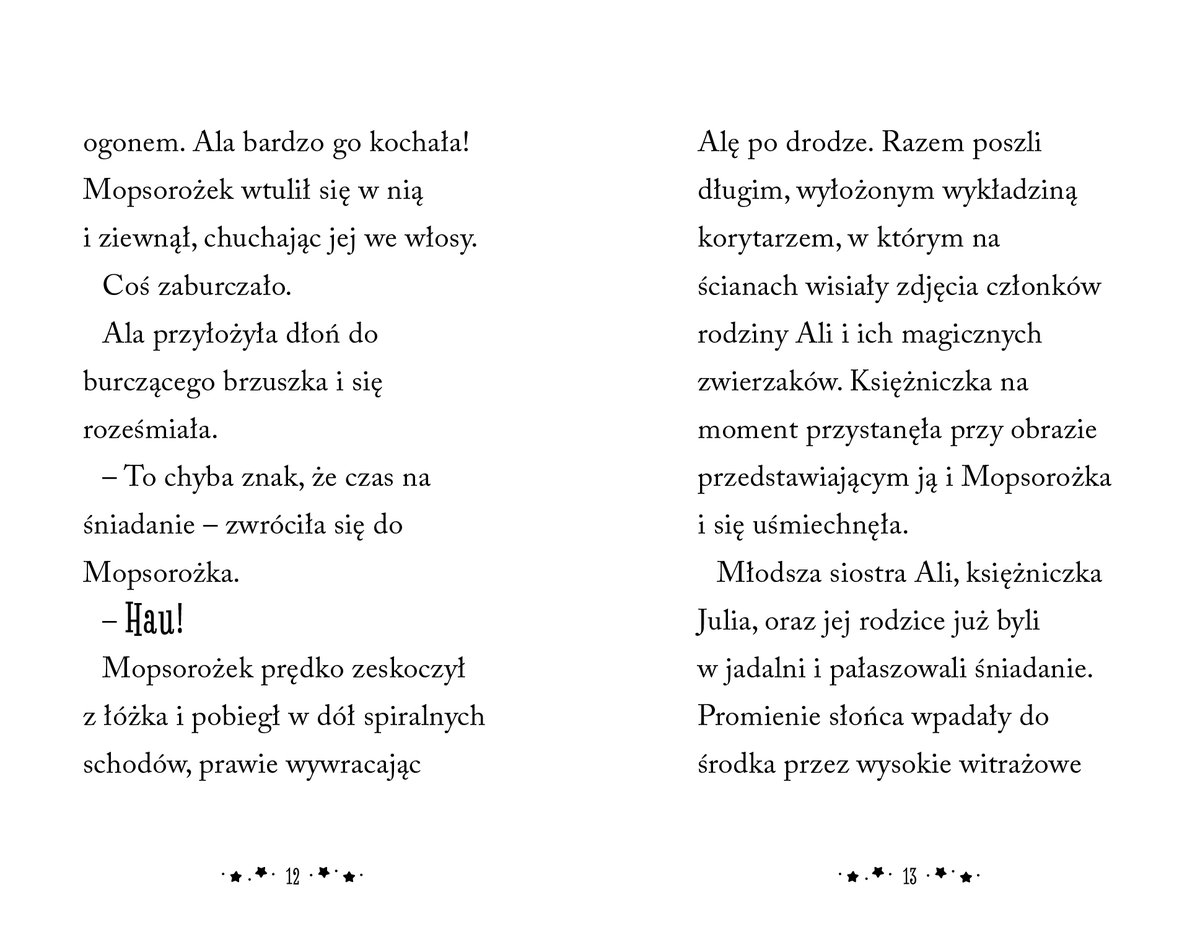 Pierwsza książka z uroczej serii Sklepik z magicznymi zwierzętami. Nowa, przygotowana dla starszych dzieci odsłona Sklepiku. Księżniczka Ala uwielbia Magiczny Sklepik ze Zwierzętami Pani Pani Łapki. W końcu to ona pomogła jej znaleźć magicznego najlepszego przyjaciela, Mopsorożka! Pani Łapka zawsze znajdzie idealne zwierzę dla każdego, kto odwiedza jej sklep.