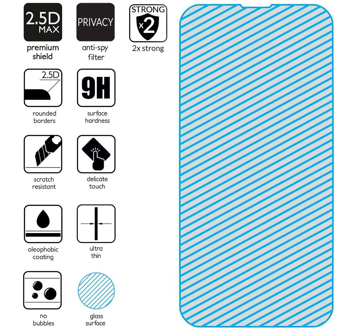 moVear 2.5D MAX privacy to najwyższej jakości szkło hartowane o krawędzi 2.5D. Pokrywa cały ekran Apple iPhone 13 Mini. Dzięki filtrowi antySpy P28™ osoby siedzące obok będą widziały zaciemniony ekran Twojego smartfona.; Oryginalny produkt polskiej marki moVear. Z funkcją prywatności – wyjątkowym filtrem prywatyzującym anti spy zapewniającym maksimum prywatności ekranu. Jedynie patrząc na wprost ekranu możemy zobaczyć jego pełną zawartość. 2x Strong - 2x bardziej wytrzymałe, poddane specjalnemu procesowi hartowania. Idealnie dopasowane do ekranu smartfona Apple iPhone 13 Mini (5.4") . Opracowane i wycięte z marginesem umożliwiającym stosowanie większości etui. Wykonane w technologii 2.5D MAX – pokrywa cały ekran. Szkło jest mniejsze od pełnego 3D ok 1mm (szerokość I wysokość), dzięki czemu jest kompatybilne z większą ilością etui. 100% powierzchni produktu pokryte nowoczesnym odpornym szkłem hartowanym mARG™. Twardość na poziomie 9H zabezpiecza przed porysowaniem. Krawędzie w technologii 2.5D – zaokrąglone, bezpieczne dla użytkownika, bardziej odporne na uszkodzenia. fullGlue 2.5D - „klej” (warstwa adsorpcyjna) pod całą powierzchnią szkła. Optymalna grubość warstwy szkła 0.3mm. Pochłania energię uderzeń, zapewnia ochronę szklanej obudowy i zmniejsza ryzyko uszkodzeń podczas upadku smartfona. Powłoka oleofobowa - odciski palców i inne zabrudzenia nie są tak widoczne i można je szybko i łatwo wyczyścić. Nie wpływa na funkcjonalność dotyku. Łatwy montaż - komplet akcesoriów i dokładna instrukcja w trzech językach (PL / EN / DE). Fabrycznie zapakowany w oryginalne stylowe opakowanie, idealne na prezent.