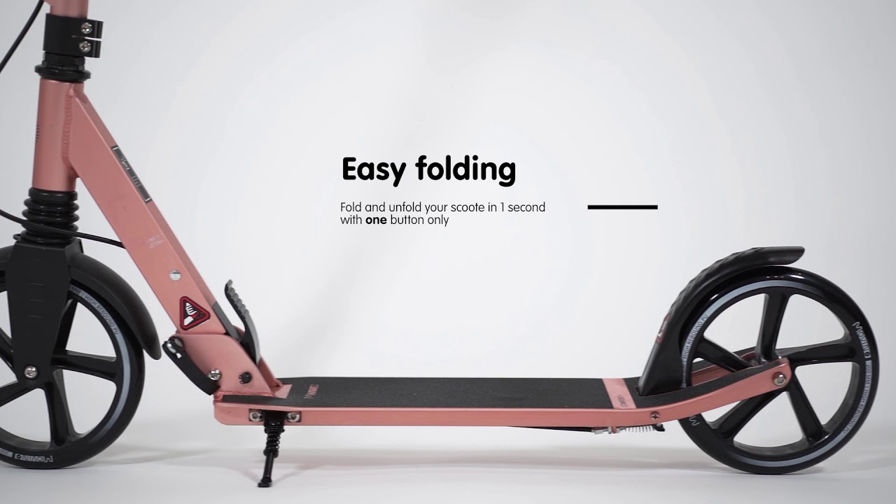 Hulajnoga Movino Comfort + posiada łatwy i wygodny system składania. Aby złożyć lub rozłożyć hulajnogę wystarczy nacisnąć jeden przycisk. Tańsze hulajnogi posiadają kilkustopniowe składanie, którego obsługa może być czasochłonna i kłopotliwa. Ze złożeniem hulajnogi Comfort + każdy poradzi sobie bez problemu.