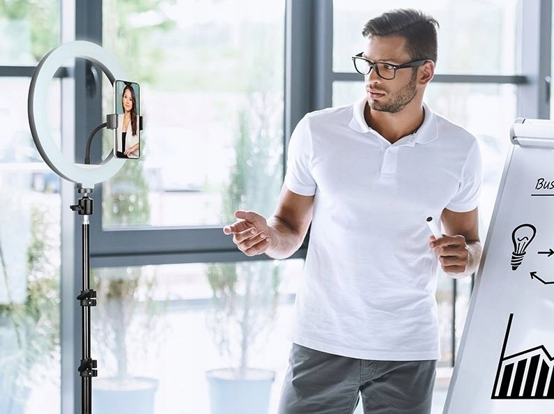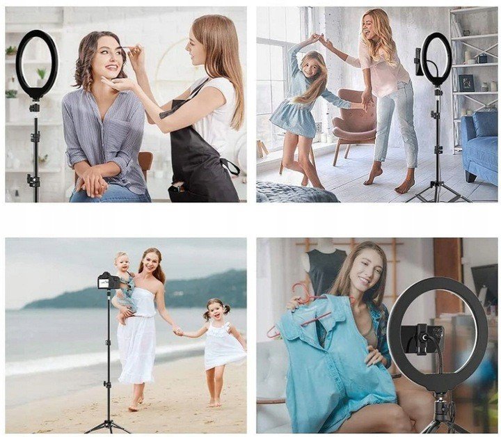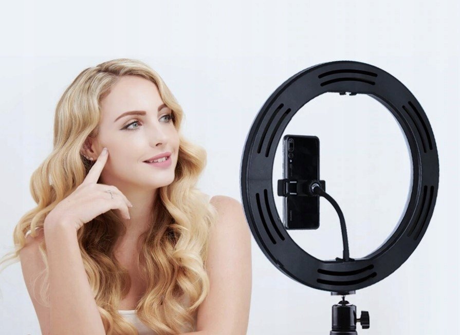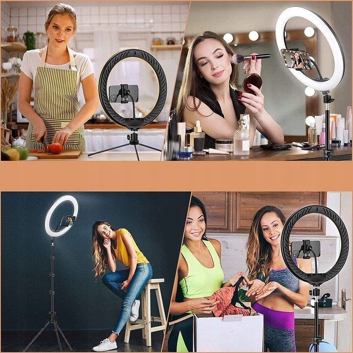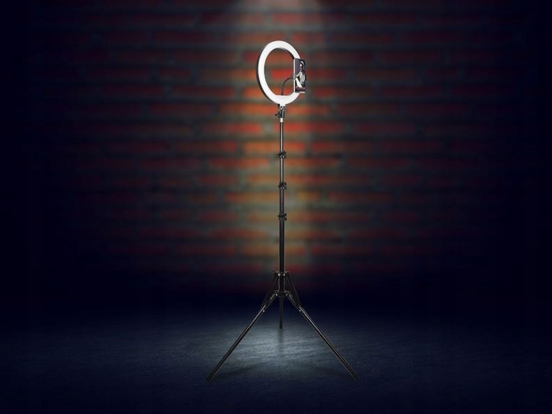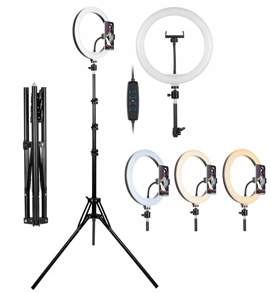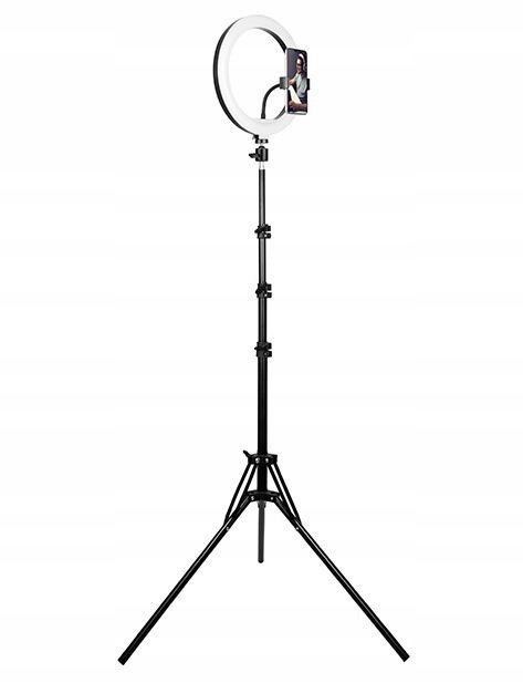 Lampa pierścieniowa RING LED ze statywem 210 cm.Wyposażenie stanowiska twórców na Tik Tok oraz Instagram, Doskonały do make-upu i pokazów online!Niezbędny element wyposażenia stanowiska gamingowego streameraAkcesorium PC niezbędne do wideo-spotkań oraz do e-szkoły!Regulowany statyw z głowicą obrotową,Zestaw jest wyposażony w lampę o średnicy 30cm i statyw 210 cm oraz pilot na przewodzie pozwalający, regulować natężenie światła oraz barwę światła,Lampa posiada 160 diod LED,Emituje światło o temperaturze 2700-7000K, lampa posiada 3 barwy: zimna, ciepła , neutralna,Każda z barw 10 poziomów natężenia światła co łącznie daje 30 różnych wariacji,Lampa o mocy 14.5W – emituje światło o mocy 900-1700 lumenów w zależności od włączonego programu,Statyw posiada antypoślizgowe stopki, dzięki czemu zestaw jest bardziej stabilny,Statyw ma wymiary 50cm gdy jest złożony dzięki czemu jest bardzo poręczny i łatwy do przenoszenia. Posiada możliwość regulacji ustawienia na różnych wysokościach. Po całkowitym rozłożeniu ma wysokość 185cm.Statyw posiada obrotową głowicę, która umożliwia ustawienie dowolnego kąta i montażu w 3 pozycjach,Uchwyt na telefon jest bardzo plastyczny,Lampa jest zasilana przez kabel USB o długości 200 cm,Lampa wymaga zasilania 5V DC o natężeniu minimum 500mA ( możliwość podłączenia do portu USB komputera), natomiast pełną deklarowaną moc osiąga przy podłączeniu do zasilacza 5V / 3A. Zasilacz nie jest częścią zestawu.