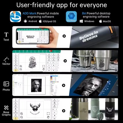 Może być używany do wykonywania grawerów na tkaninach, skórze, znakowania plastiku, identyfikacji produkcji, kodów QR itp.