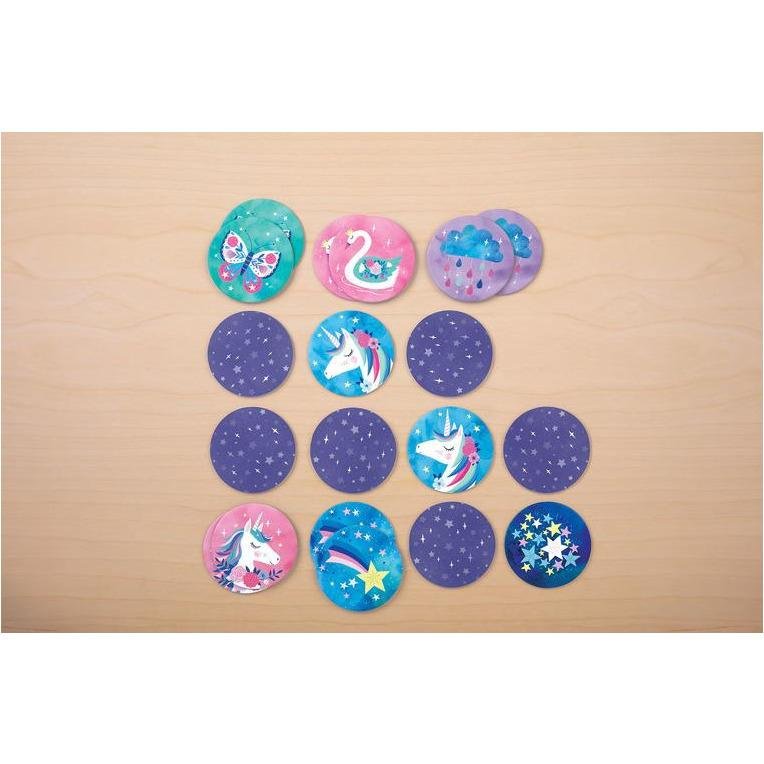 Świetna Mini gra Memory Magiczne jednorożce ćwiczy pamięć, uczy cierpliwości i skupienia. Parę tworzą dwie identyczne ilustracje. Karty mają przyjemne dla oka kolory i przedstawiają magiczny świat jednorożców.