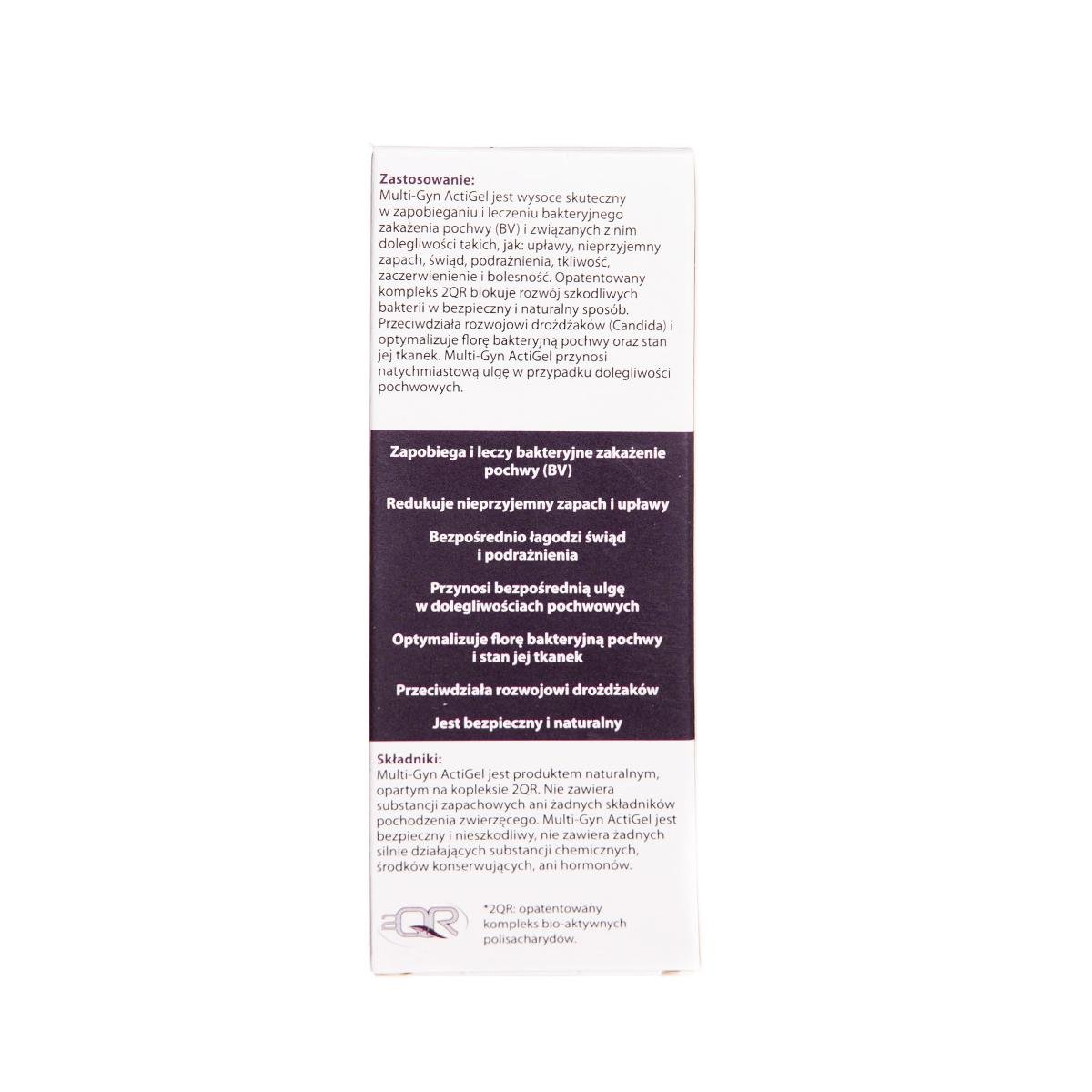 Multi-Gyn ActiGel oparty jest na opatentowanym kompleksie 2QR. Ta naturalna substancja pochodzenia roślinnego w bezpieczny i naturalny sposób chroni tkanki przed szkodliwymi bakteriami. Multi-Gyn ActiGel wspiera również naturalny proces leczenia. Przywraca optymalną kwasowość pochwy (wartość pH), które wspiera rozwój pożytecznych bakterii (pałeczek kwasu mlekowego) optymalizując florę bakteryjną pochwy. Daje ulgę bezpośrednio po aplikacji. Redukuje nieprzyjemny zapach i upławy. Łagodzi świąd i pieczenie pochwy. Jest to delikatne i wysoce skuteczne leczenie bez znanych szkodliwych działań niepożądanych.