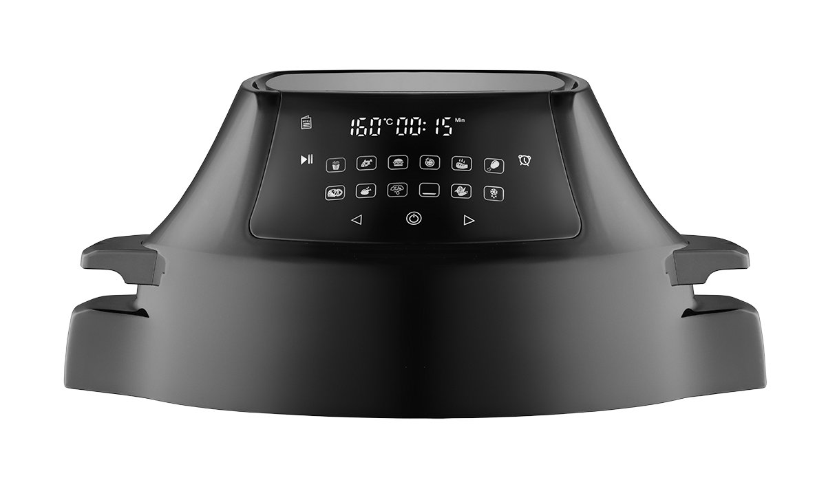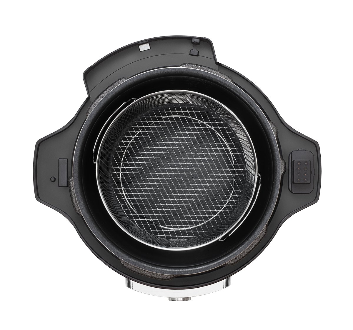 Szybkowar z pokrywką do gotowania na gorącym powietrzu w pełni zastąpi frytkownicę. Oferuje 12 programów, jak frytki, ryby, pizza, suszenie i inne, z możliwością regulacji temperatury od 80 do 200C.