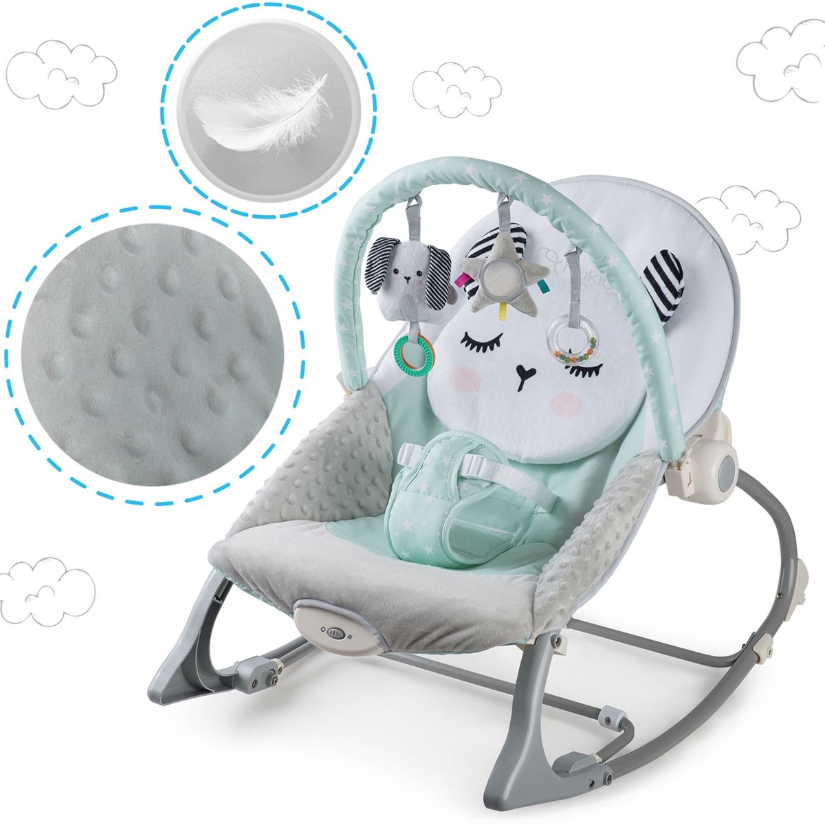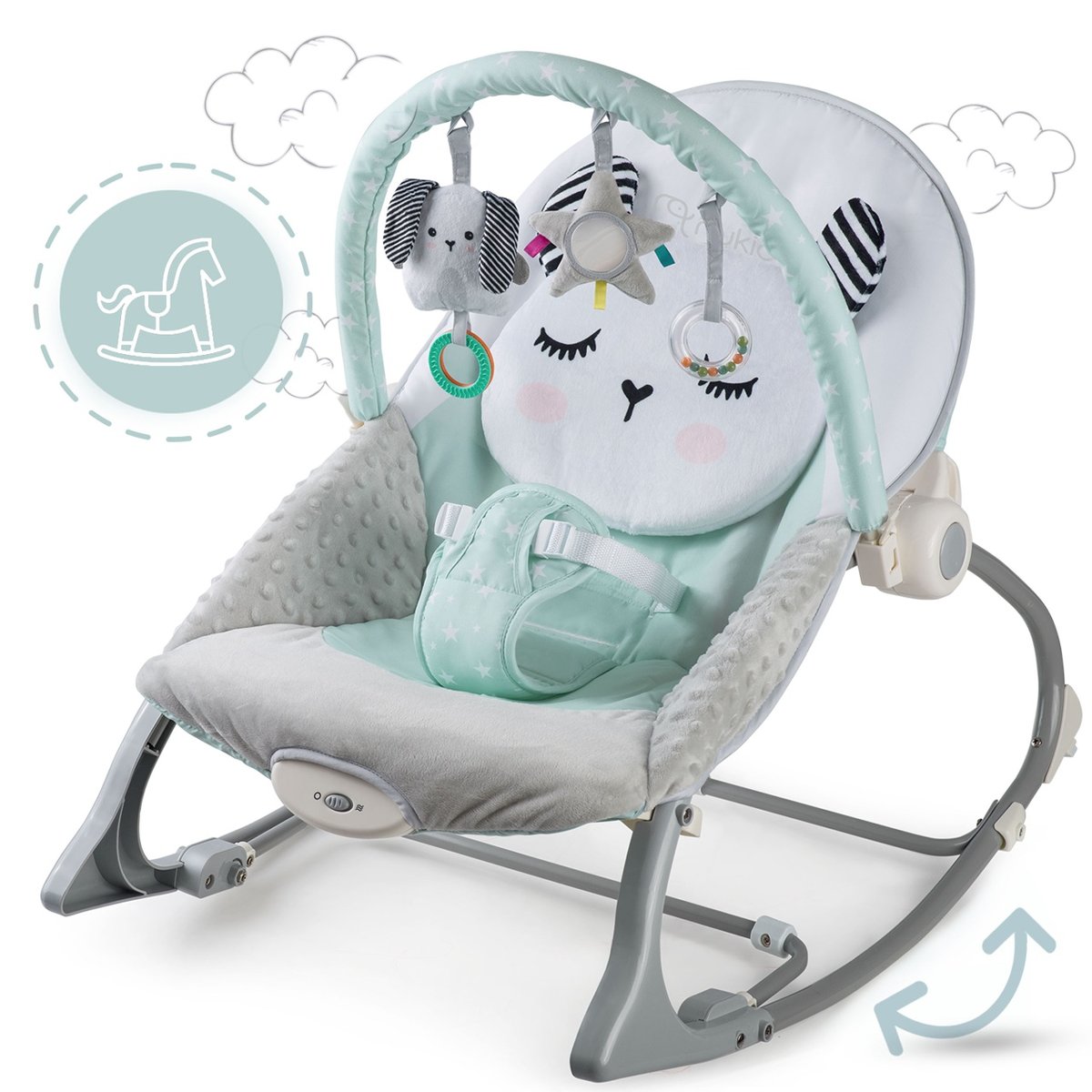 Leżaczek został wyposażony w zdejmowany pałąk z przyczepionymi szeleszczącymi zabawkami.. Zapewnią one Twojemu dziecku rozrywkę, podczas gdy Ty będziesz mógł odpocząć. Te wyjątkowe zabawki stymulują wzrok oraz rozwijają zmysł dotyku.