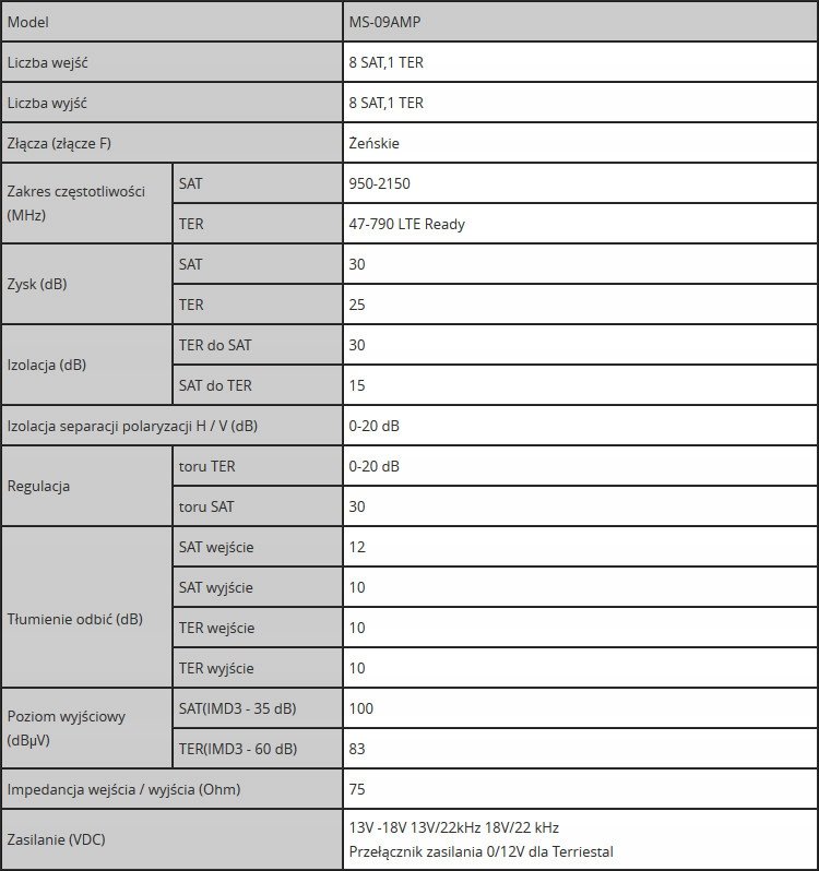 Zakres częstotliwości TER: 47-694MHz LTE Ready