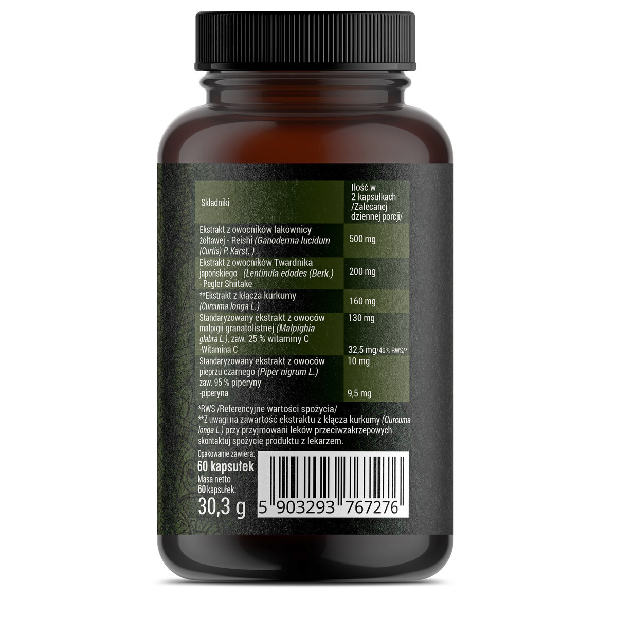 Ekstrakt z owocników lakownicy żółtawej -Reishi (Ganoderma lucidum (Curtis) P. Karst.), ekstrakt z owocników Twardnika japońskiego (Lentinula edodes (Berk.) - Pegler Shiitake , **ekstrakt z kłącza kurkumy (Curcuma longa L.), standaryzowany ekstrakt z owoców malpigii granatolistnej (Malpighia glabra L.), zaw. 25 % witaminy C, kapsułka - (substancja glazurująca - hydroksypropyloceluloza), standaryzowany ekstrakt z owoców pieprzu czarnego (Piper nigrum L.) zaw. 95 % piperyny, substancja wypełniająca - celuloza mikrokrystaliczna.