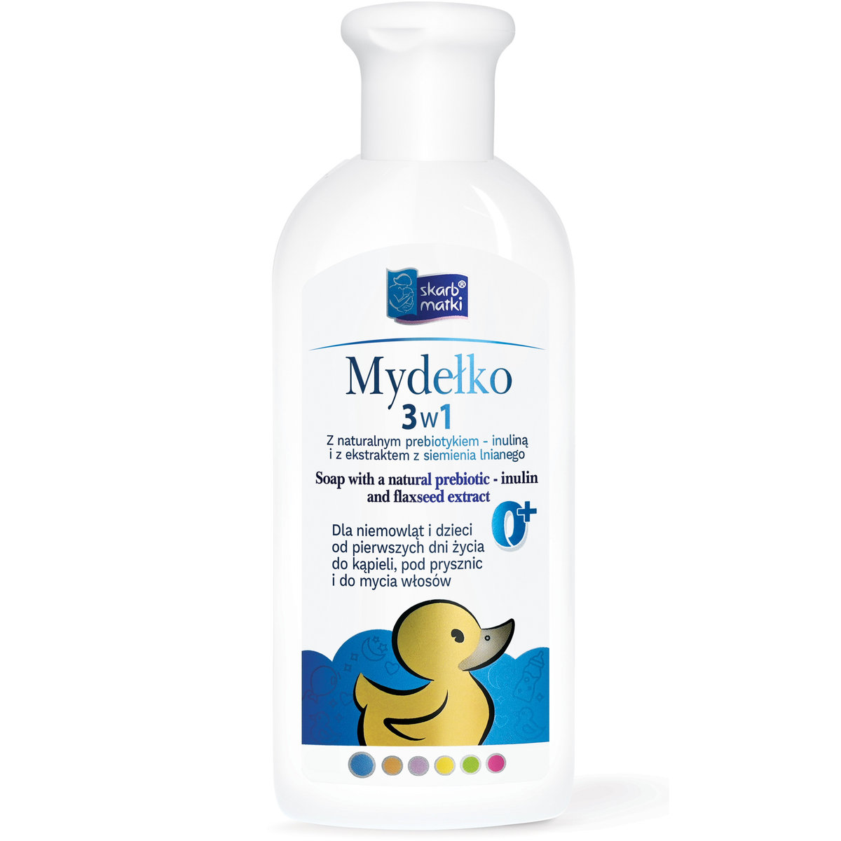 Mydełko 3 w 1 to łagodny kosmetyk do codziennego mycia ciała i włosów od pierwszego miesiąca życia. Można je również stosować jako płyn do kąpieli i szampon. Delikatnie myje, nie wysusza skóry głowy i ciała, lekko nawilża. Pozostawia skórę gładką i miłą w dotyku. Zawiera delikatne substancje myjące i kondycjonujące włosy. Kompozycja zapachowa została dobrana z myślą o nawet najbardziej wrażliwej i skłonnej do alergii skórze dzieci.