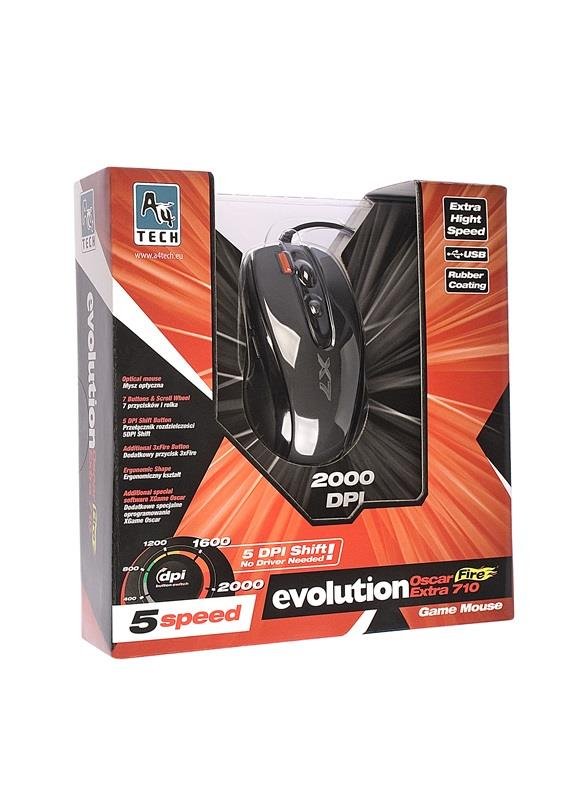 Mysz A4Tech z serii XGame, wyposażona w 7 przycisków, optyczny sensor, ultra szybkie złącze USB oraz szereg dodatkowych atutów, stworzonych specjalnie z myślą o graczach i grafikach komputerowych. Dodatkowy przycisk 3XFire umożliwia oddanie trzykrotnego strzału w czasie gry zaledwie jednym naciśnięciem klawisza. Zmieniający kolor przełącznik rozdzielczości 5DPI (od 400 do 2000 DPI) umożliwia zwiększanie lub zmniejszanie czułości myszy bez potrzeby instalowania dodatkowego sterownika i wpływa bezpośrednio na szybkość i precyzję działania. W komplecie oprogramowanie Oscar, umożliwiające zapamiętanie sekwencji 16 ruchów jednym przycisku.