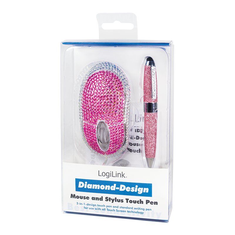 Mysz przewodowa LogiLink ID0124 Diamond optyczna USB 800dpi różowa & TouchPen Cechy: Mysz optyczna & TouchPen z długopisem, 3 przyciski, Rolka przewijania pionowego, TouchPen z ...